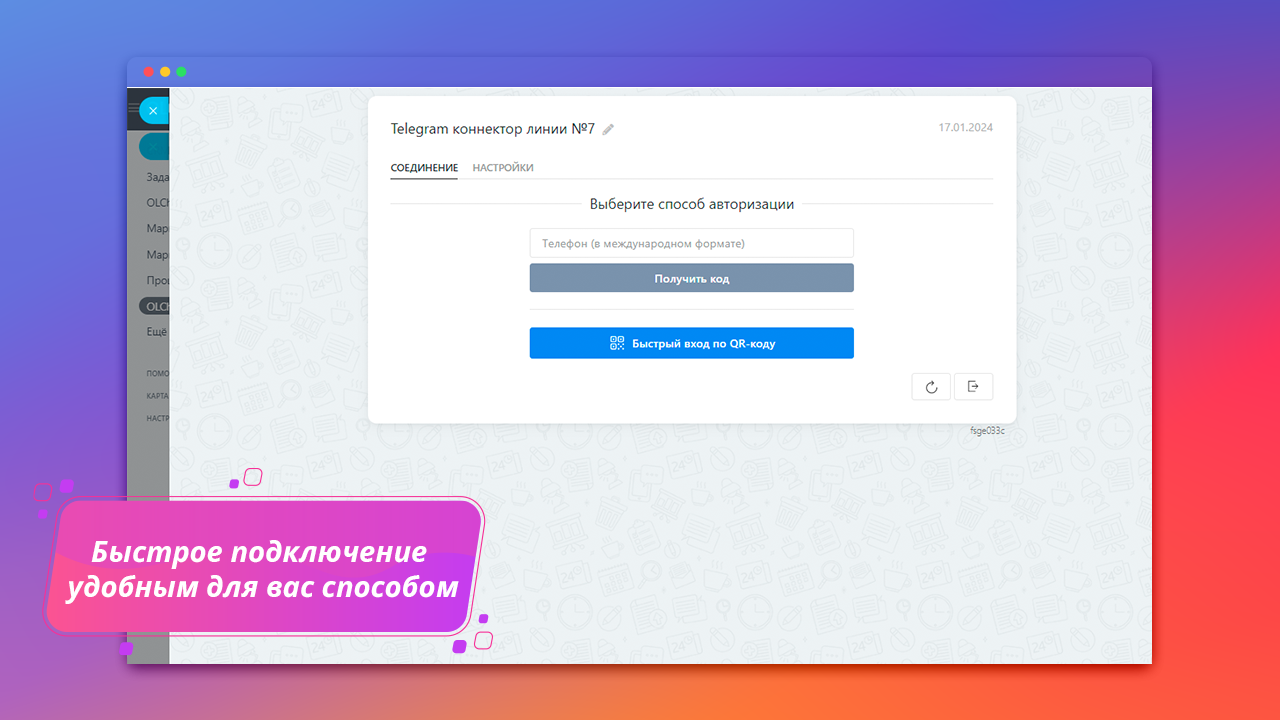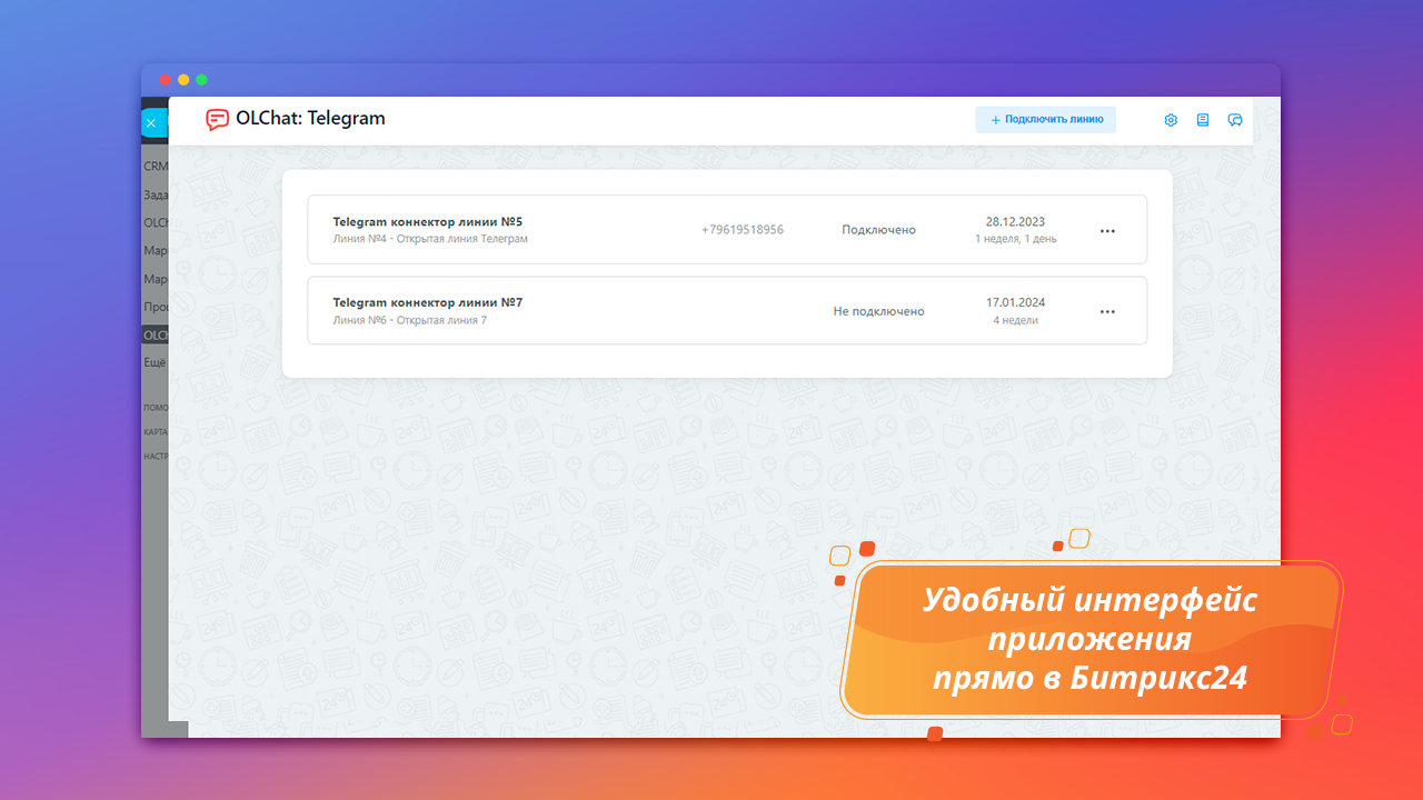 Простое подключение — нужно просто отсканировать QR-код или вписать код. Прямо в Битрикс24 - да ещё и без лишних личных кабинетов на других сайтах!