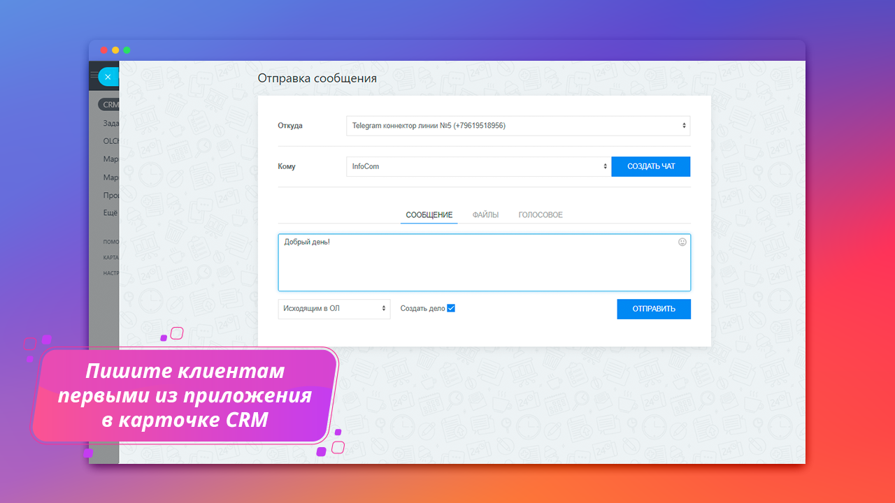 Пишите первыми клиентам в Telegram прямо из карточки CRM. Отправляйте сообщения, изображения, документы, аудиофайлы.