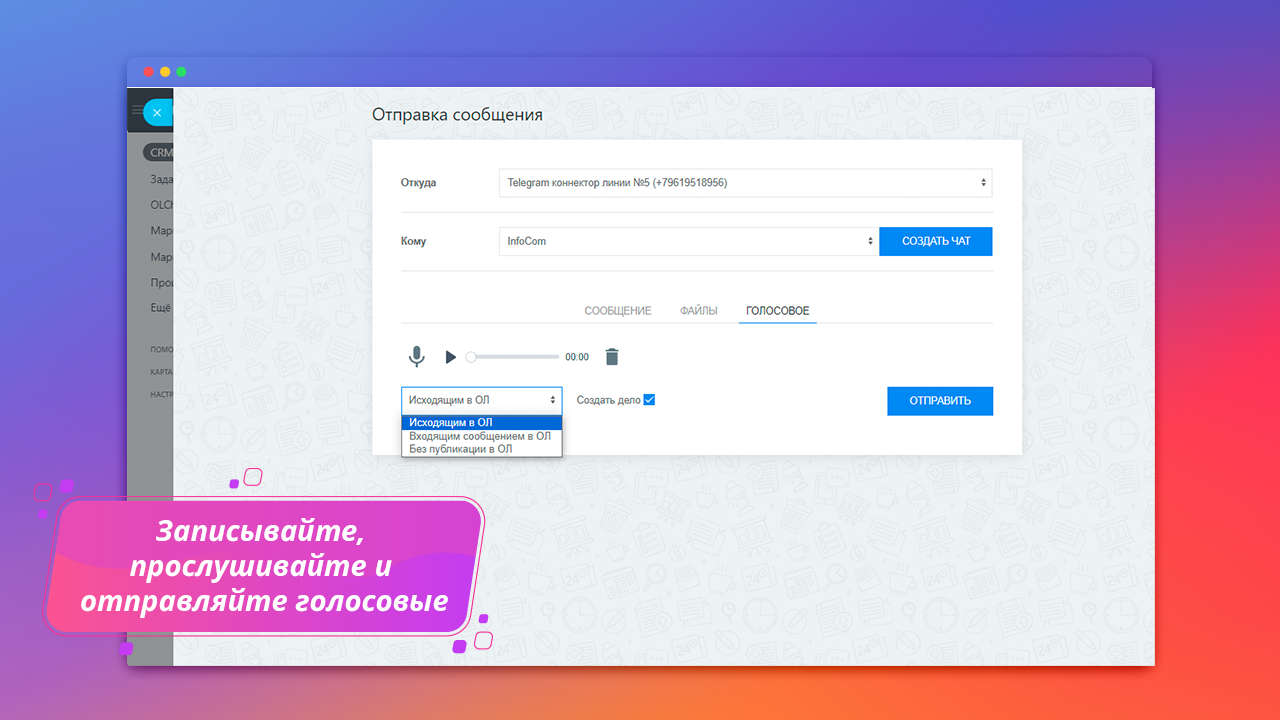 - Записывайте и отправляйте голосовые сообщения клиентам прямо из вашего Битрикс24.