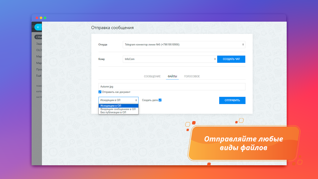 - Отправляйте файлы и свои шаблоны сообщений с эмодзи из карточки.