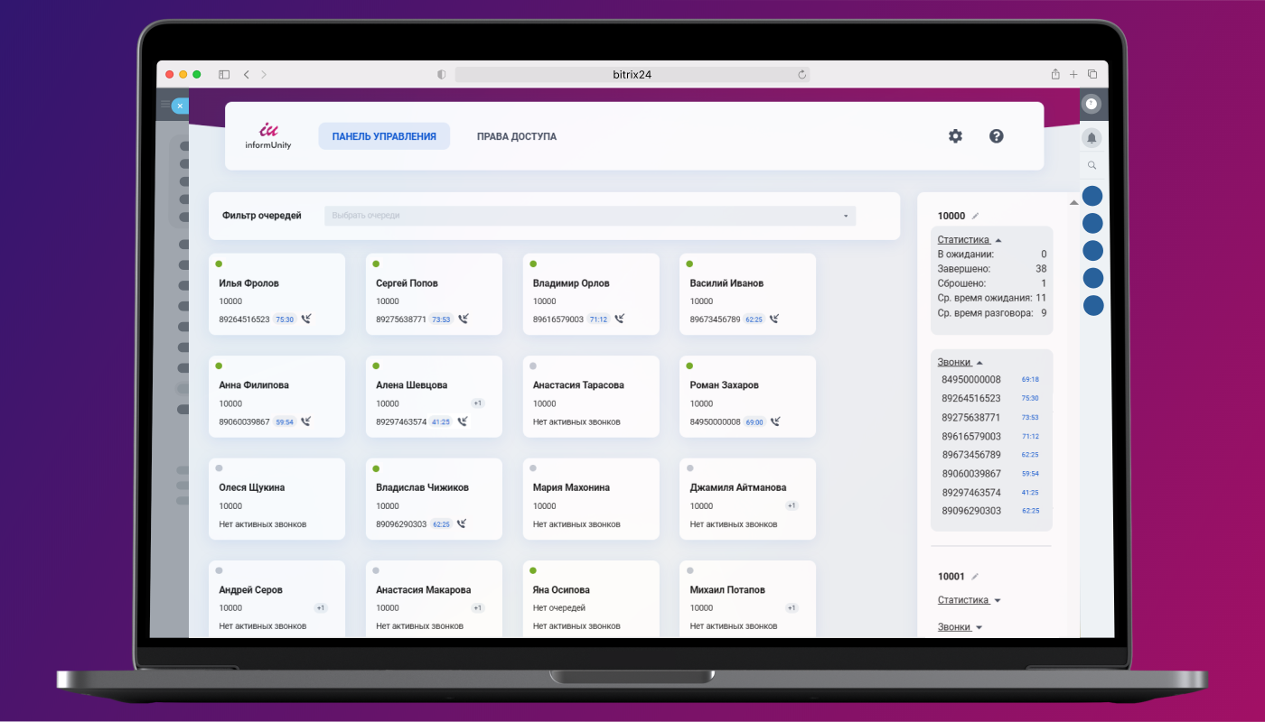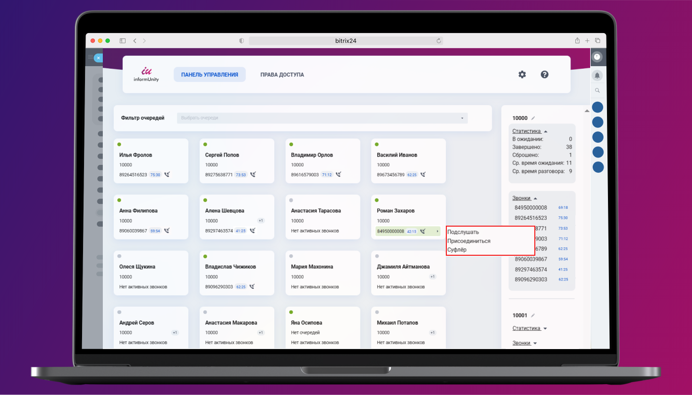 ОСНОВНЫЕ ВОЗМОЖНОСТИ:Мониторинг операторов: видно, кто из сотрудников свободен или занят, а также к какой группе и очереди они относятся.