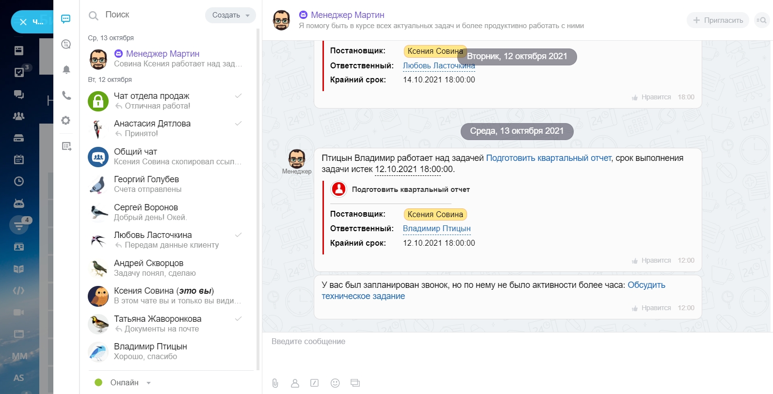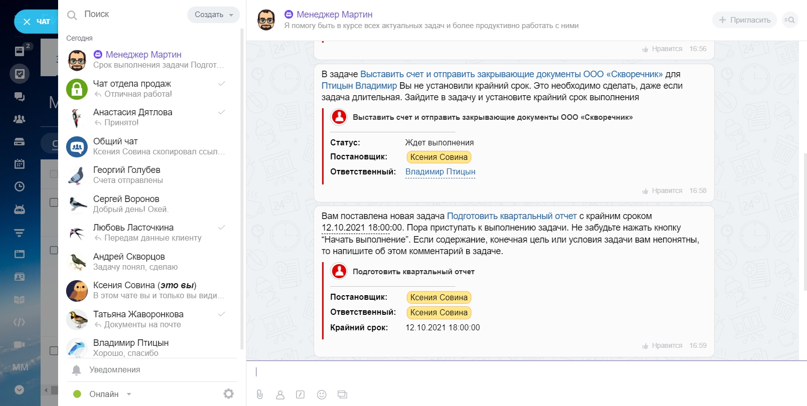 Менеджер-бот Мартин - заменяет менеджера среднего звена, следит за тем, как сотрудники выполняют задачи, выполняют ли они их в срок, делают ли они по ним комментарии, выполняют ли необходимые действия, контролирует чек-лист. Он смотрит внутри программы за действиями сотрудников и отправляет уведомления.