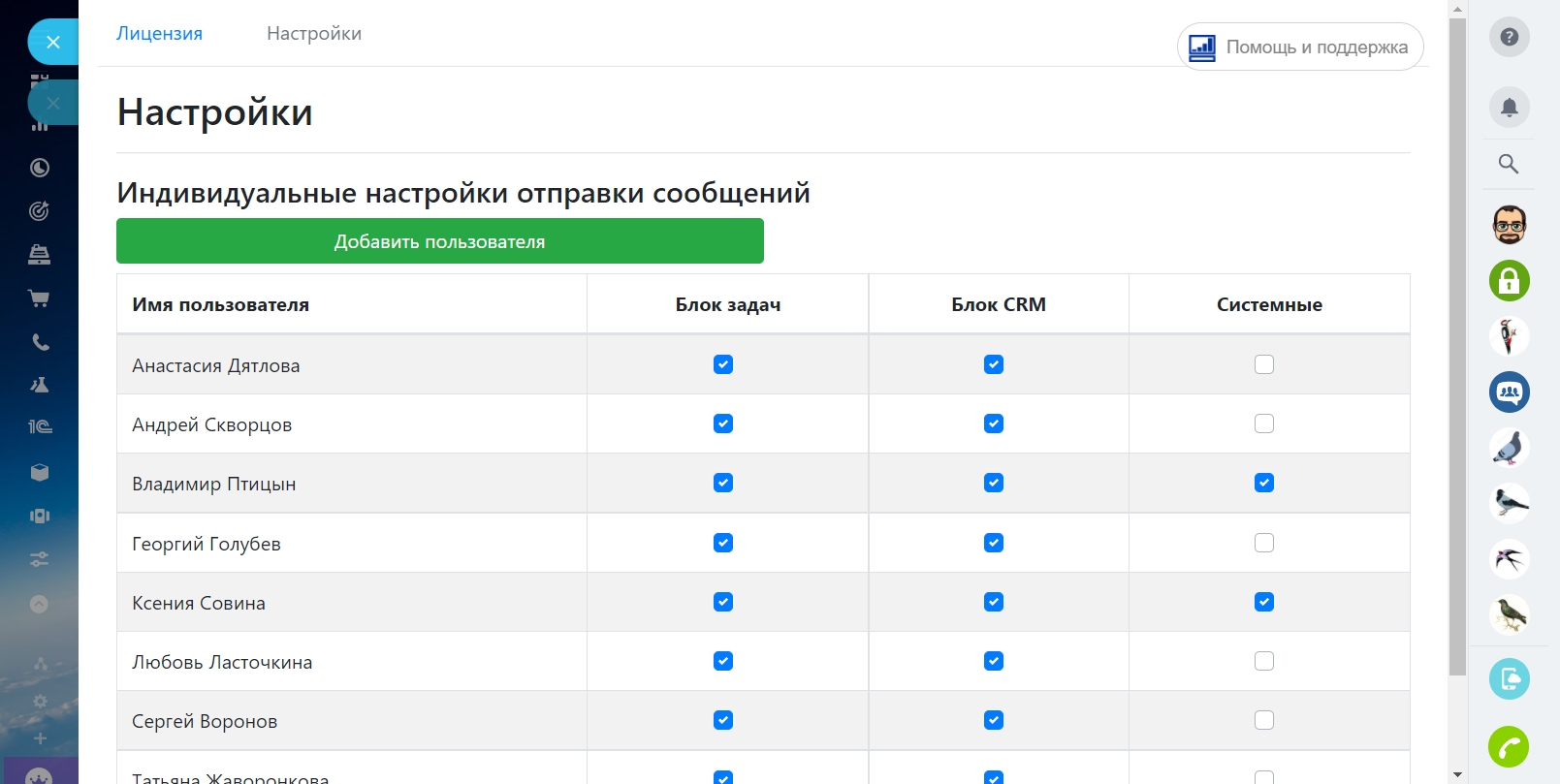 Настройки: По умолчанию, после установки, Мартин работает со всеми пользователями и отправляет им все типы сообщений. При добавлении на портал новых сотрудников, он автоматически их учитывает. Администратор портала, дополнительно, может выбрать кому из пользователей, какие сообщения будет отправлять Мартин. Для этого нужно добавить пользователя и убрать галочки, относящиеся к типам сообщений, которые Мартин не будет отправлять (блок Задач, блок CRM, системные). После чего сохранить настройки.