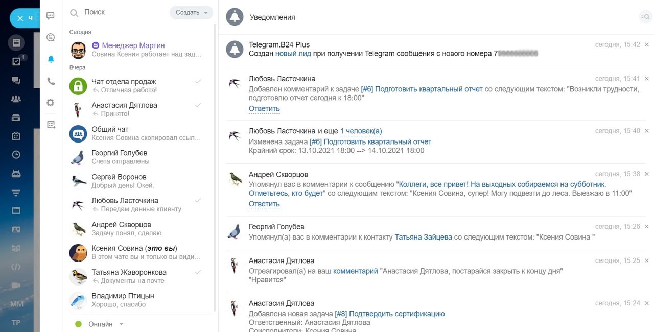 Когда в Telegram приходит сообщение с номера, не указанного в вашей CRM, приложение автоматически создаёт новый Лид и отправляет уведомление о нём пользователям портала.