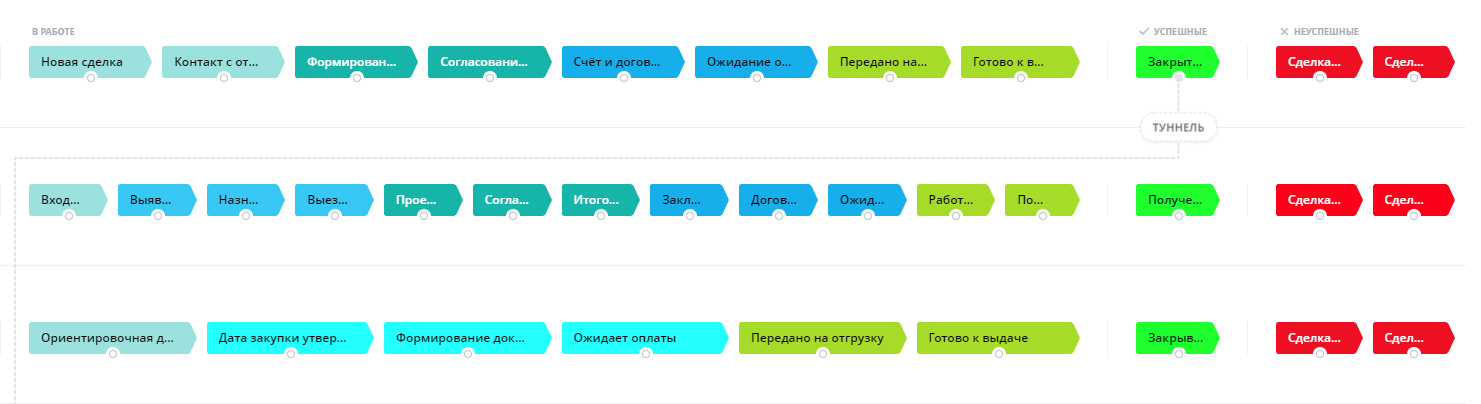 Каждое направление имеет стадии, позволяющие провести клиента от его потребностей до их удовлетворения. Использование разных воронок, позволяет оценить эффективность работы каждого направления компании по отдельности.