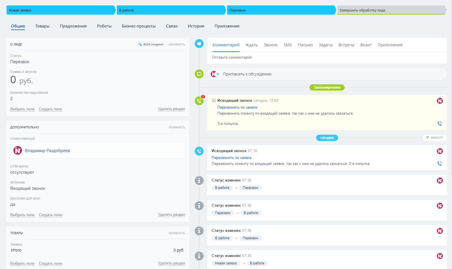 Мы настроили стадии воронки лидов для организации работы с потенциальными клиентами. Просто проведите обращение по всем стадиям и конвертируйте его в продажу.