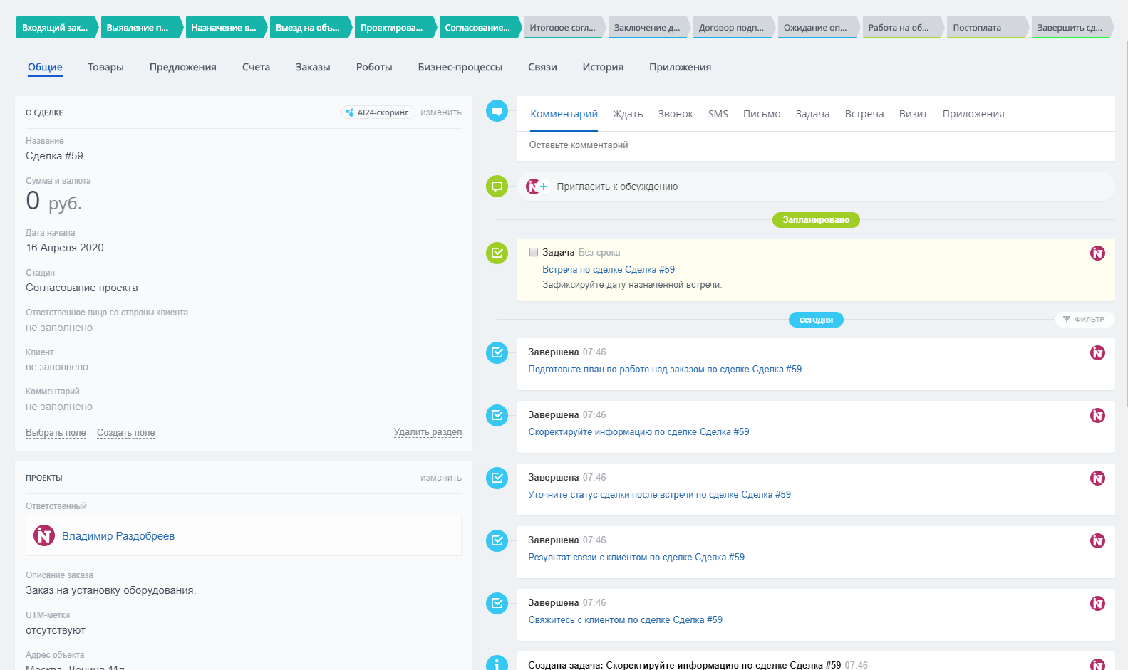 - автоматическая постановка задач и уведомлений сотрудникам в зависимости от стадии;