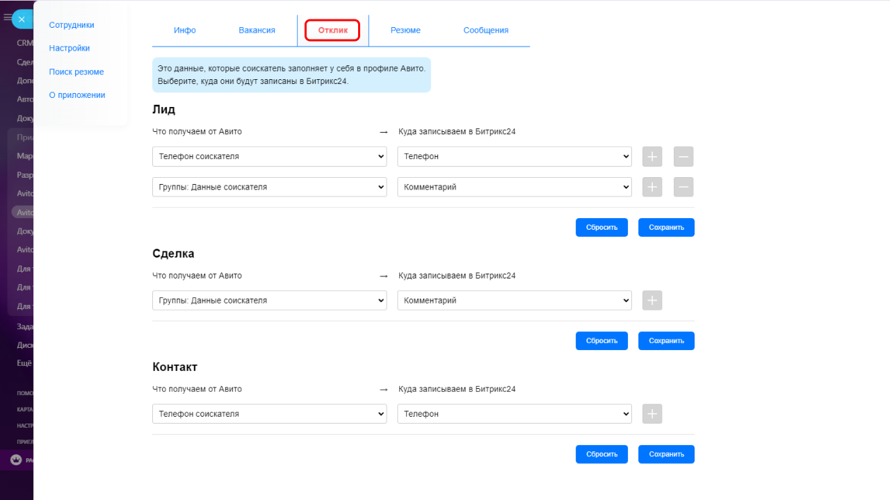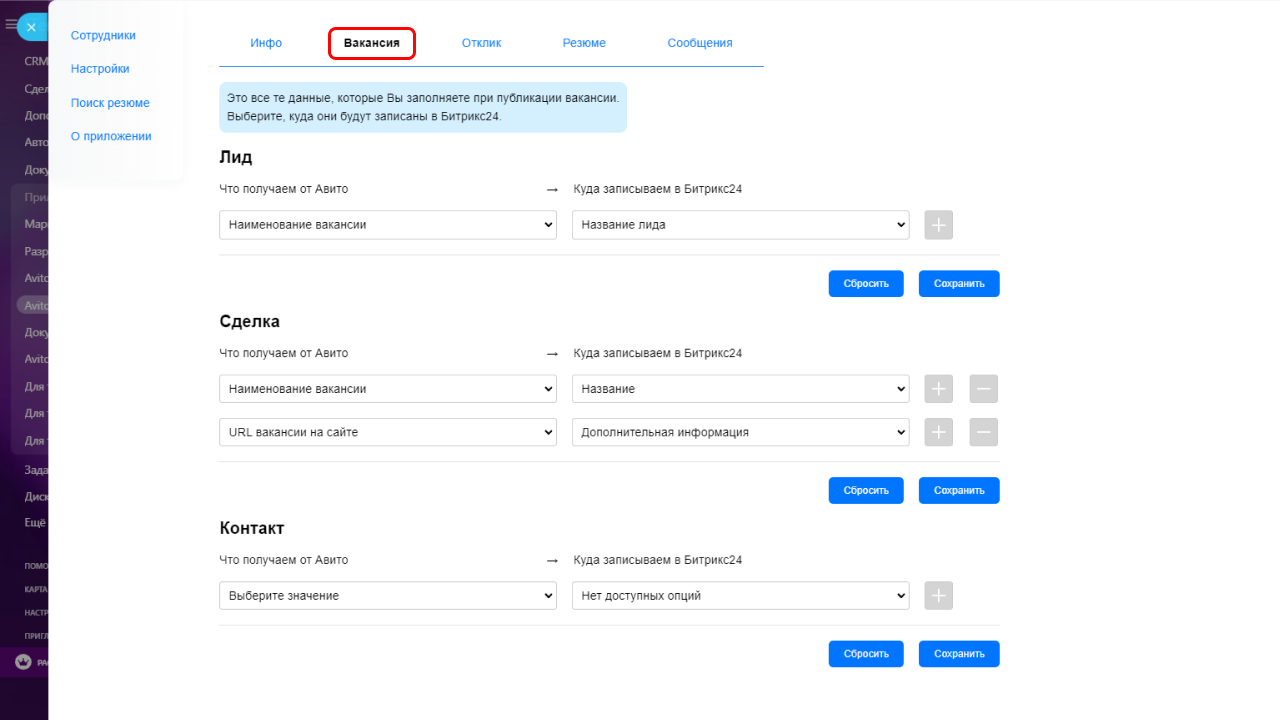 - Загрузка данных по вакансии\ резюме\ отклику из Авито на портал Битрикс24, в соответствии с пользовательскими настройками;