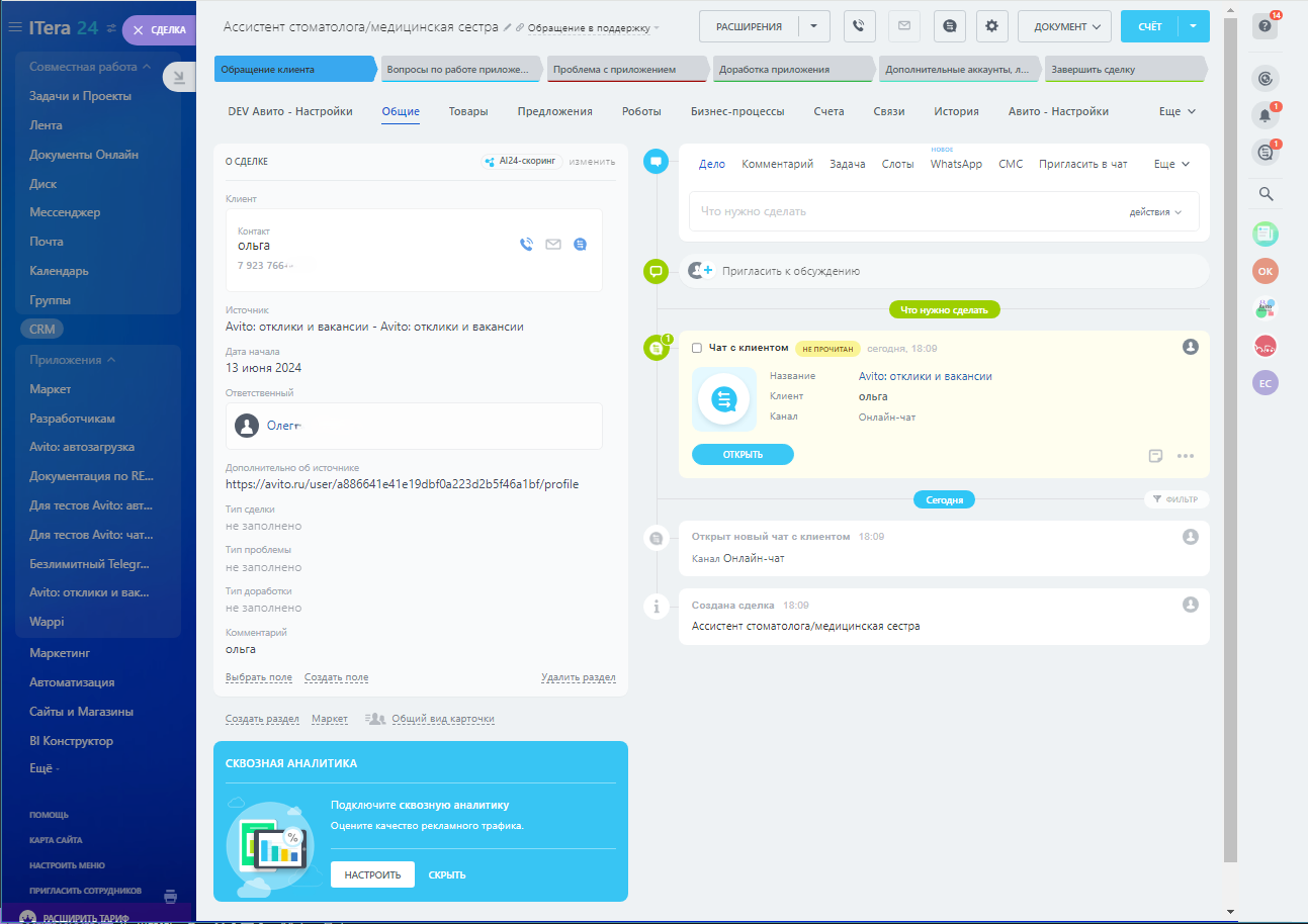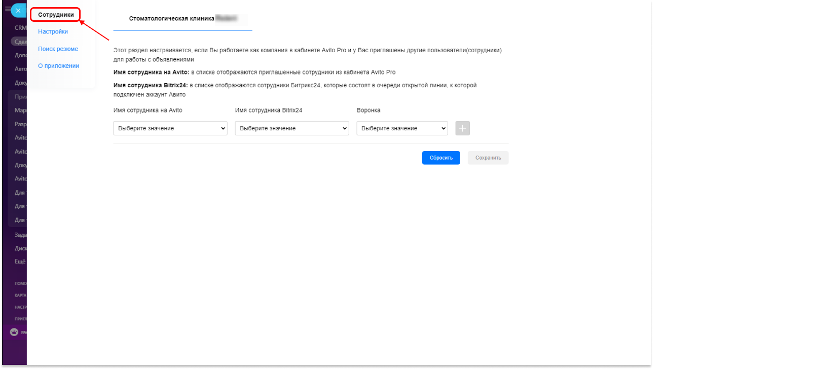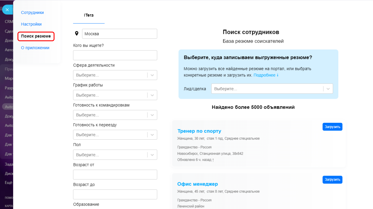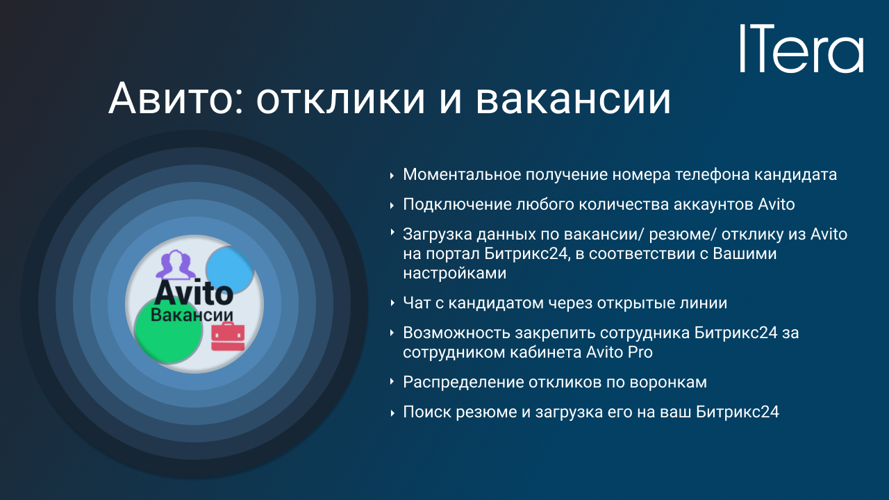 - Поиск резюме на Авито и загрузка его в ваш Битрикс24;- Возможность закрепить сотрудника Битрикс24 за сотрудником кабинета Avito Pro;