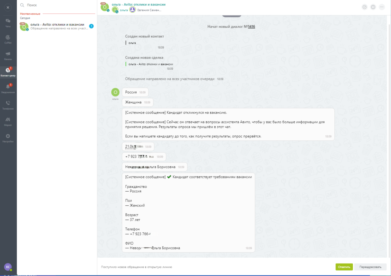 Чат, номер телефона кандидата, отклик и резюме в одном лиде или сделке.