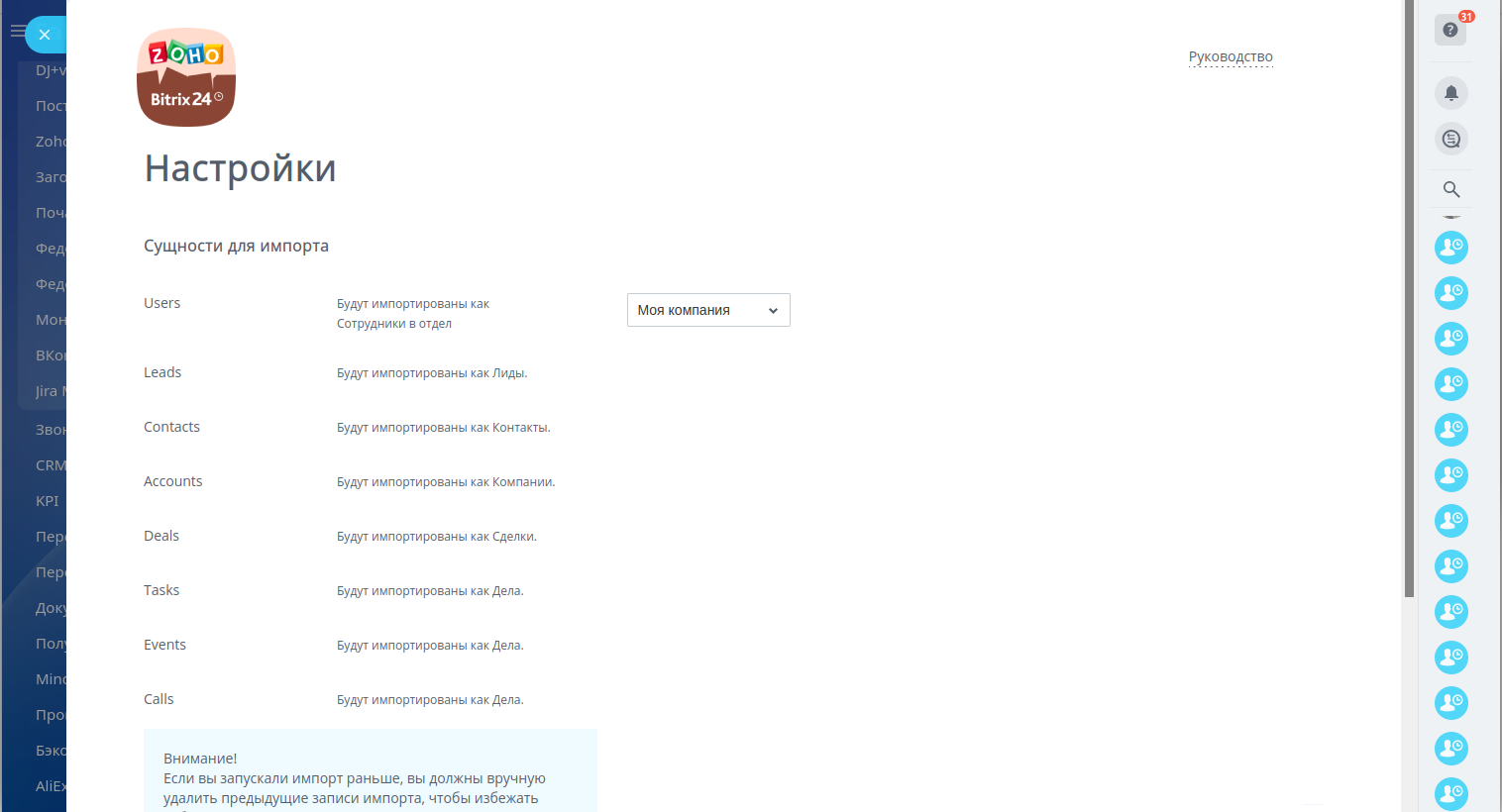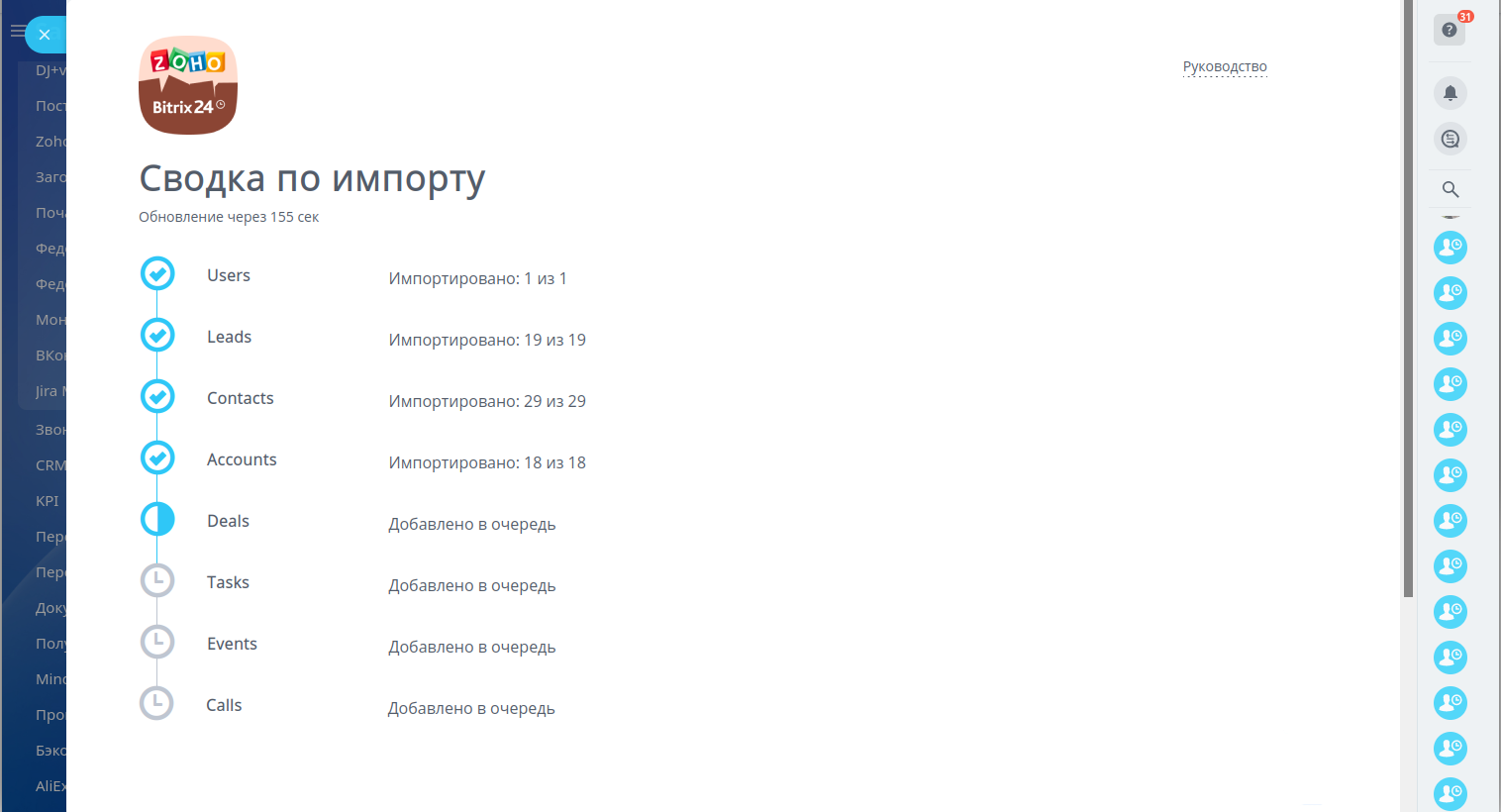 Как только вы начнете импортировать данные Zoho CRM, процесс нельзя будет приостановить или остановить до его полного завершения. Перед началом миграции убедитесь, что вы верно задали все необходимые параметры переноса данных.