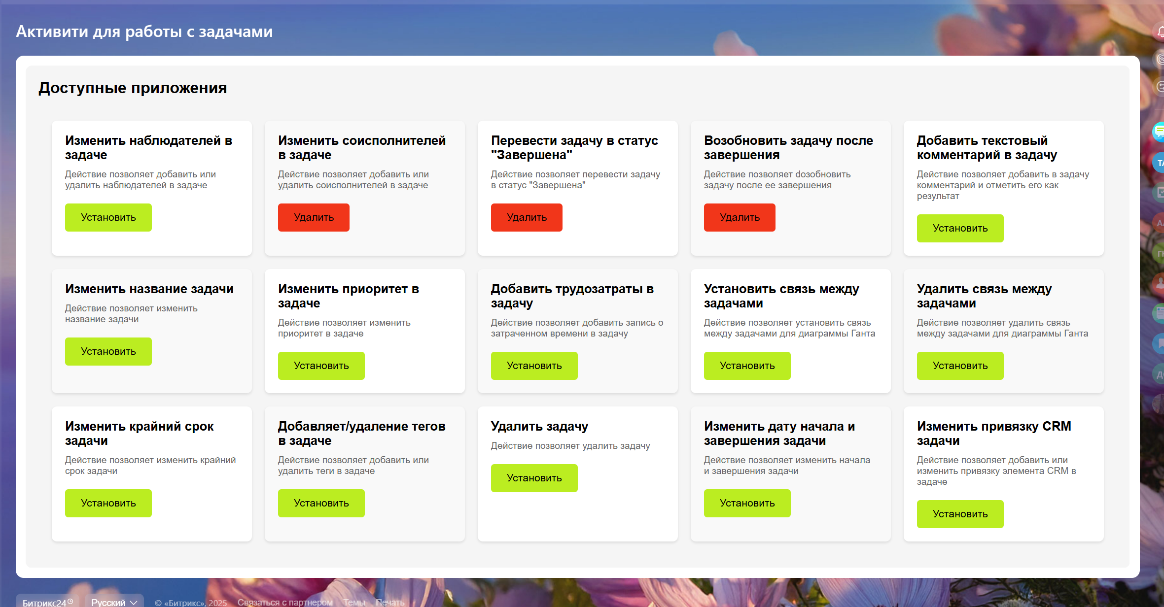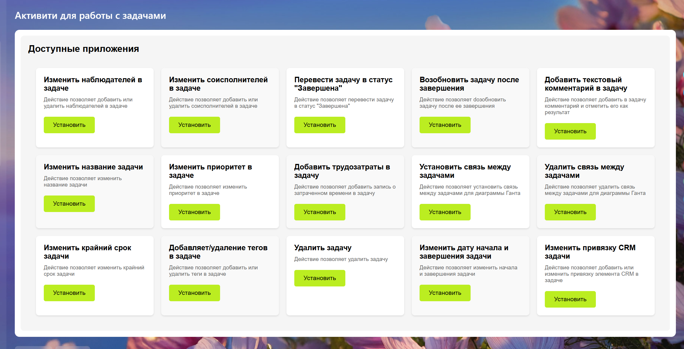 Наш набор активити основан на практическом опыте реализации различных бизнес-процессов. Мы включили в него: