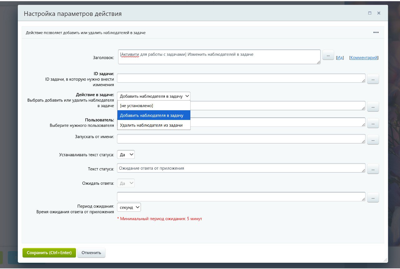 Позволяет изменить наблюдателей в указанной задаче. Можно выбрать тип изменения: добавление или удаление существующих.