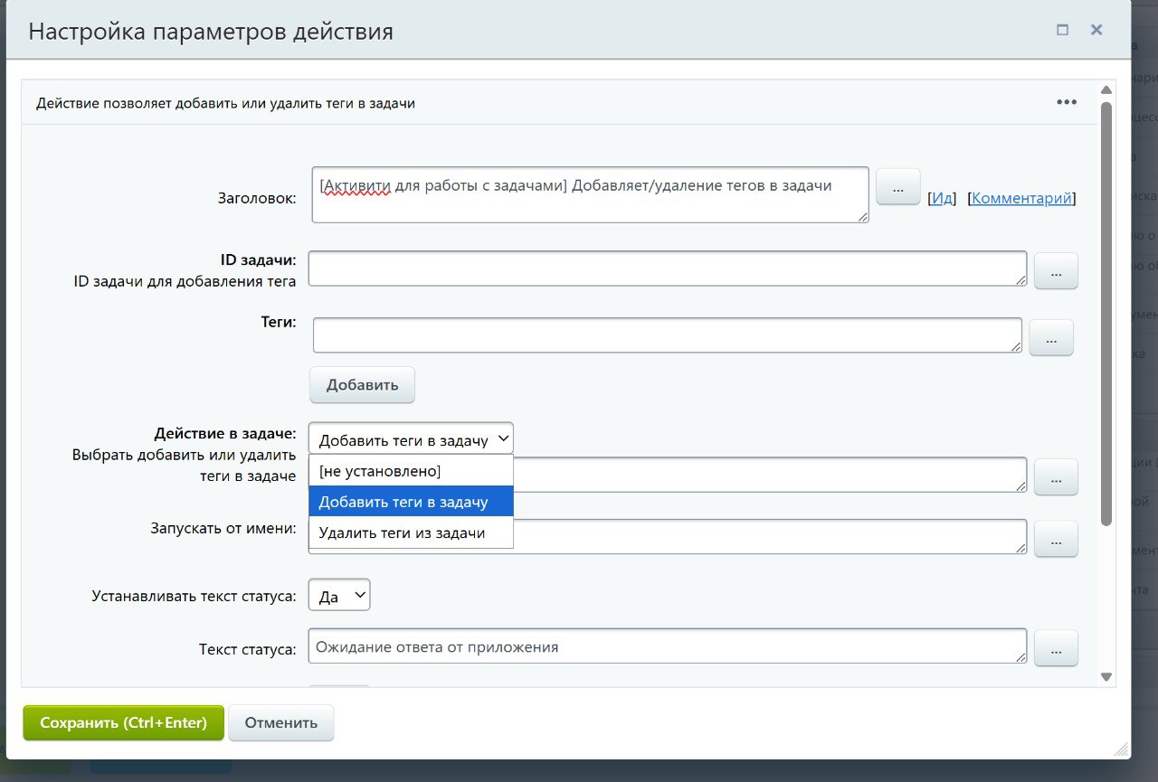 Позволяет изменить теги в указанной задаче. Можно выбрать тип изменения: добавление или удаление ранее добавленных тегов