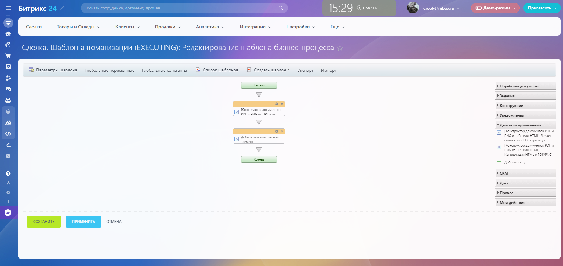Конструктор документов PDF и PNG из URL или HTML – это активити для роботов и бизнес-процессов, которое конвертирует документы из html или скачивает их по url и сохраняет в Битрикс24 в формате pdf или png