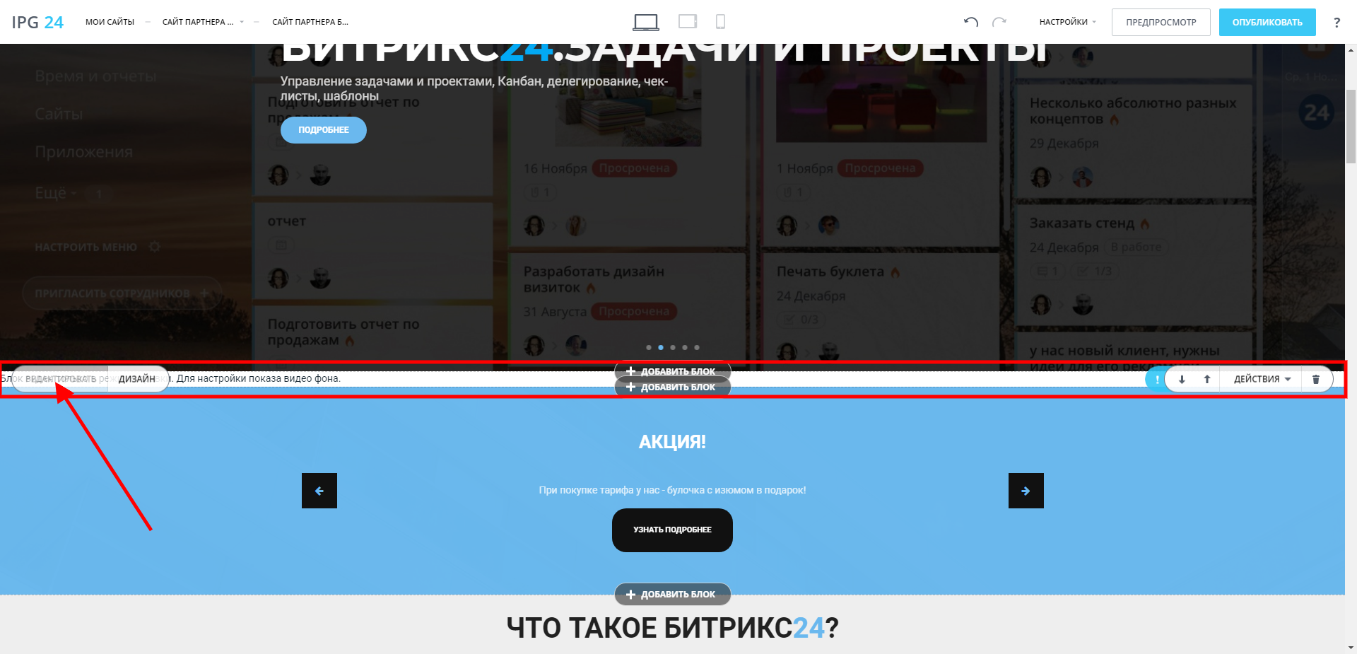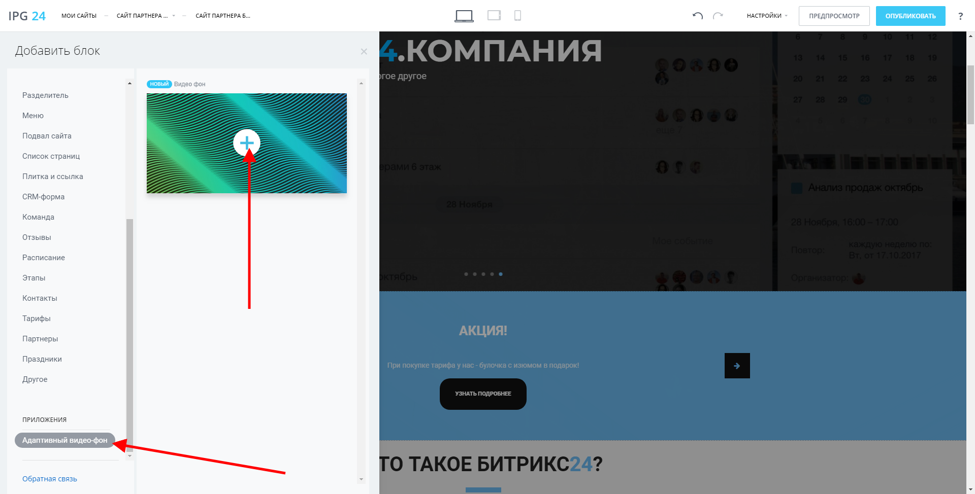 Далее вам нужно перейти в Битрикс24.Сайты и открыть для редактирования страницу на которой вы бы хотели разместить "Адаптивный видео-фон" и добавить наш блок в любом месте страницы