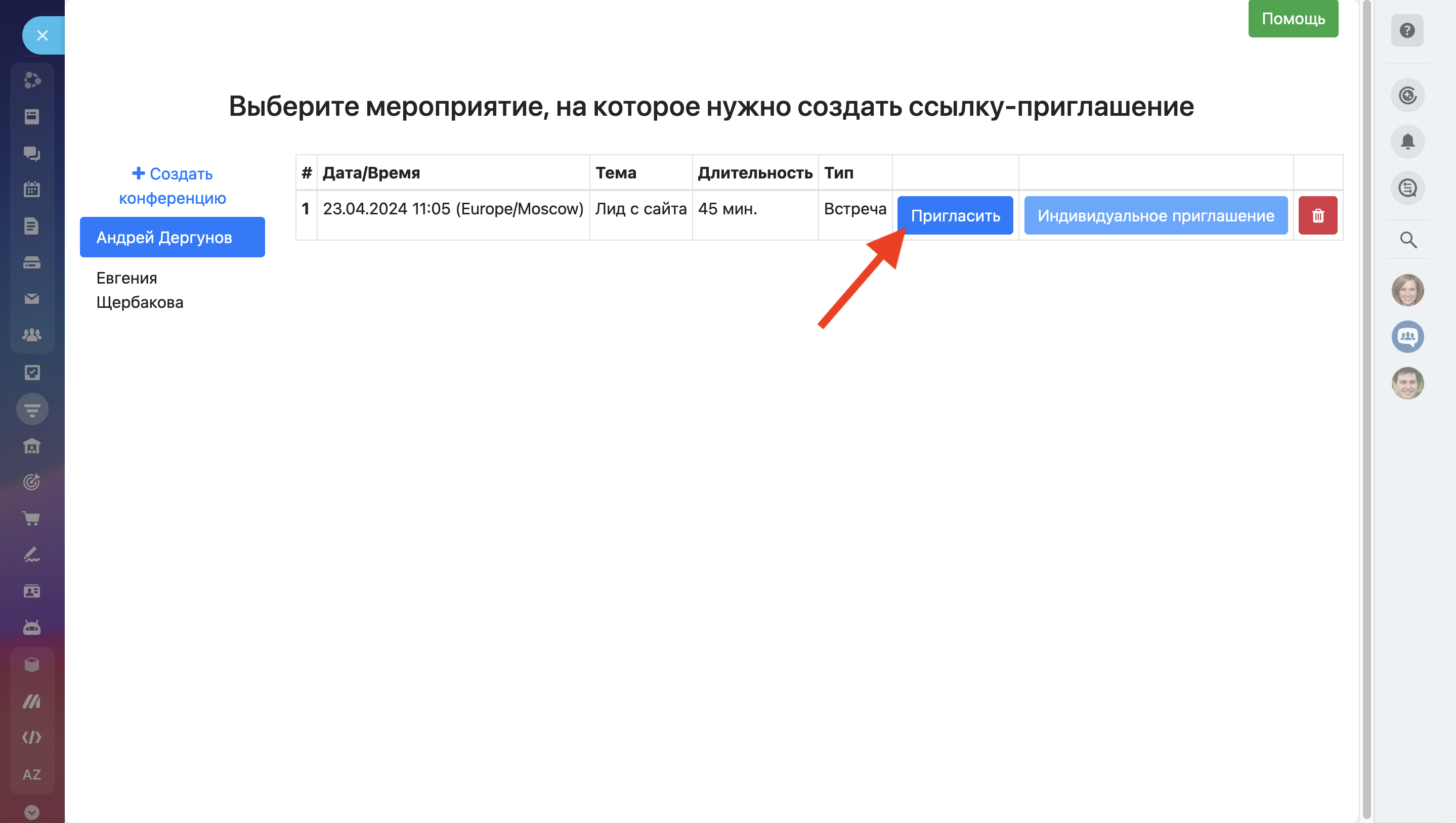 3. Создай любой (можно не настоящий) Лид. В нем вызови Bitconf и выбери приглашение на созданную в п.1 встречу. (Здесь можно выбрать и уникальное приглашение, но оно сработает корректно, только если в анкете регистрации на встречу нет обязательных вопросов, поэтому мы рекомендуем использовать простое приглашение).