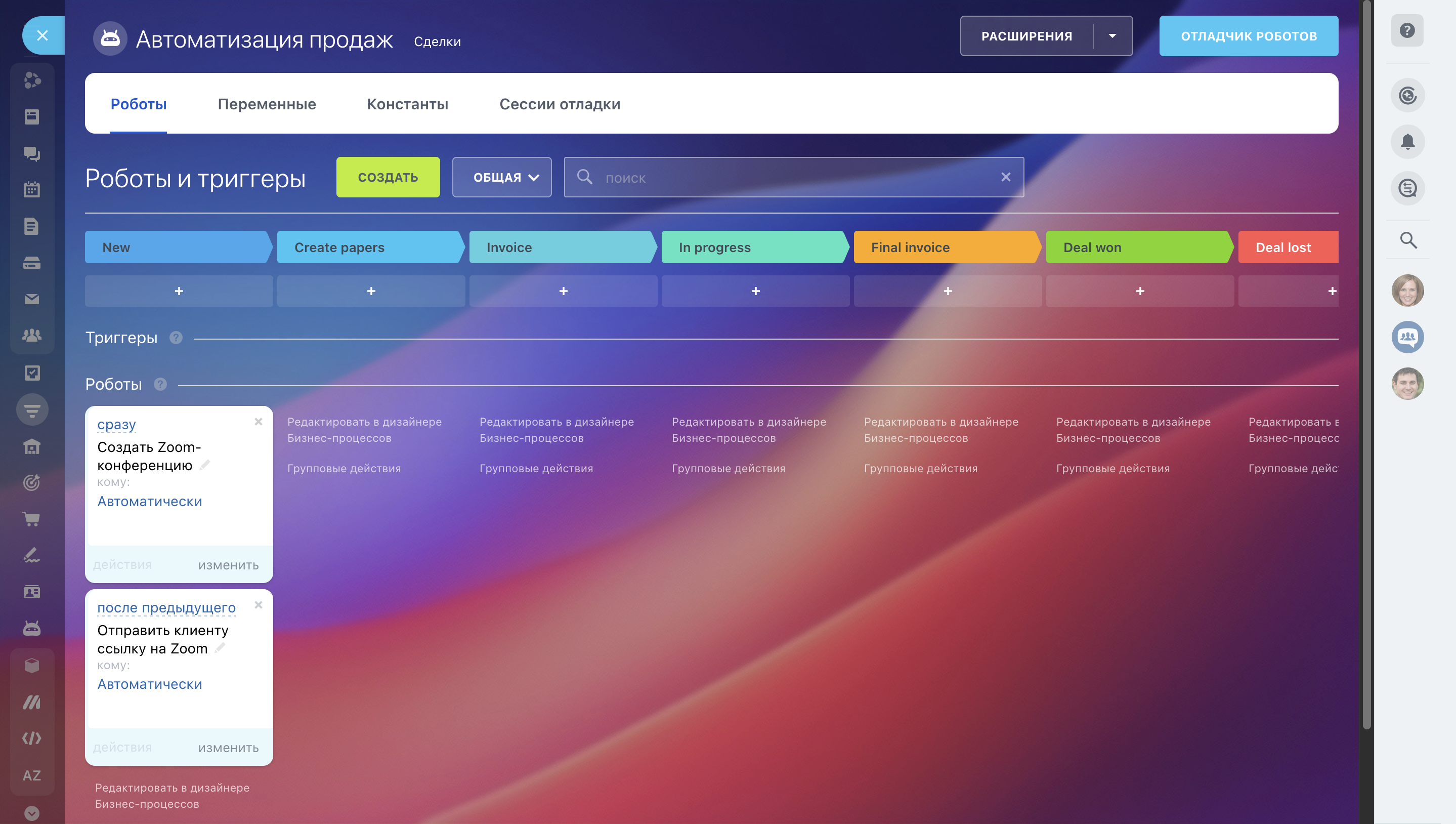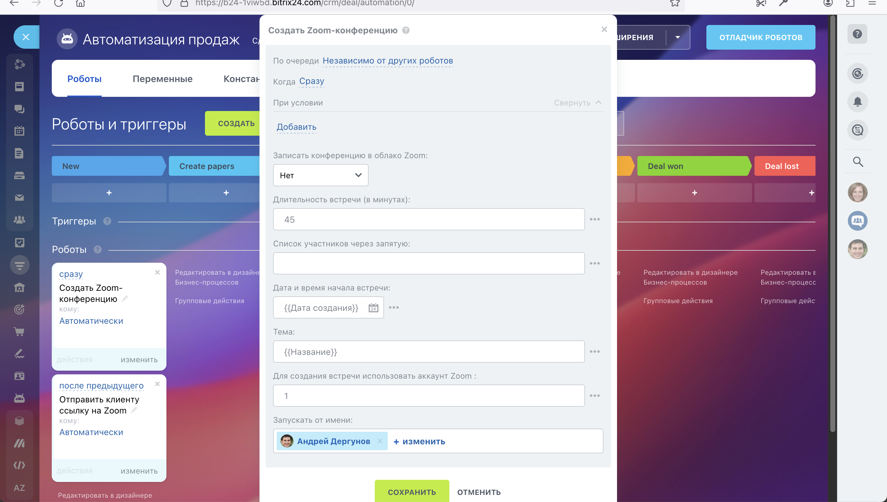 – Создай робота, который создает Zoom встречу на нужной тебе стадии Лида или Сделки.