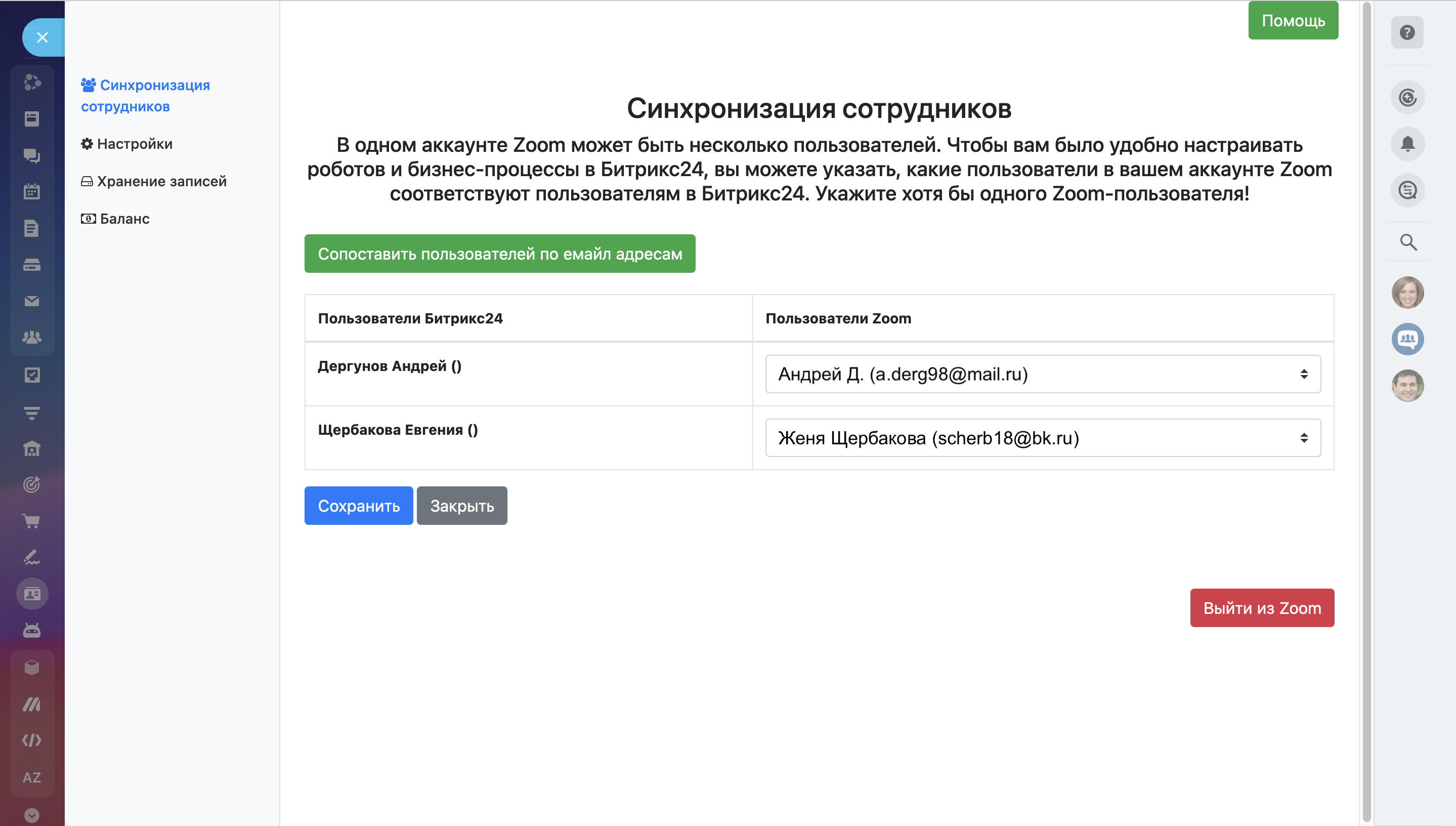В настройках приложения произведи сопоставление, какой пользователь Zoom соответствует пользователю в Битрикс24. После этого ориентироваться в расписаниях станет очень легко.