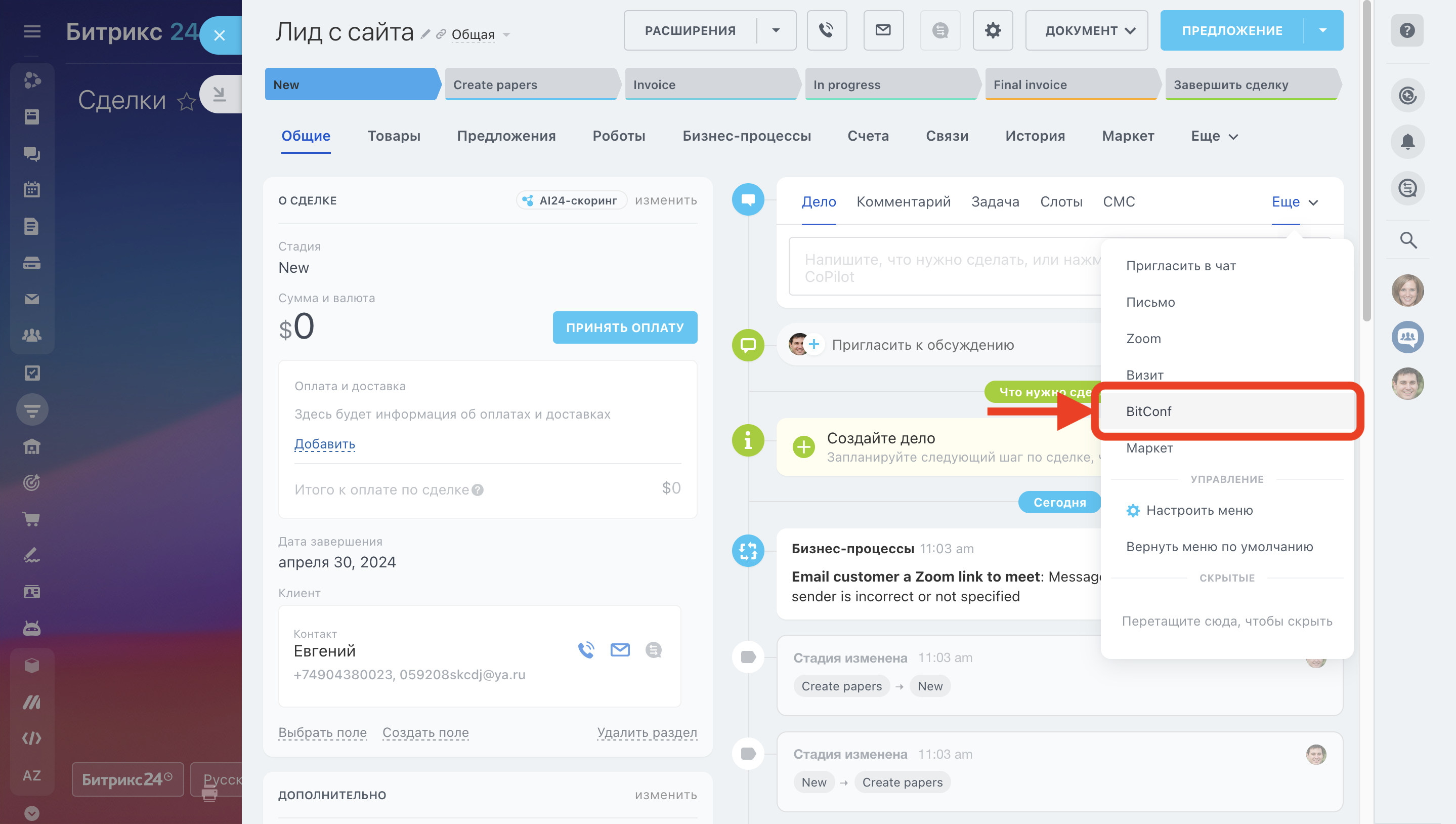 – Открой Лид (Сделку, Контакт или Компанию) в CRM. Кликни выпадающее меню блока действий в ленте событий и выбери "Bitconf";