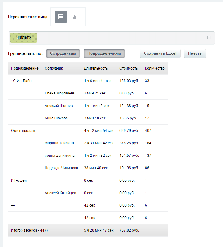 Для удобства анализа таблица имеет сортировку по полям длительность, дата вызова, статус и стоимость. Предусмотрена возможность группировки данных по сотрудникам/подразделениям и вывод получаемых таблиц на печать.