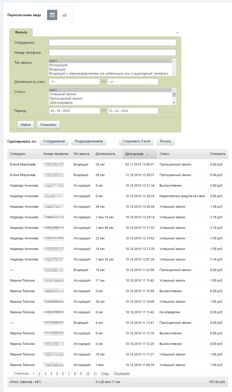 Расширенная статистика звонков с возможностью группировок и анализа звонков по длительности.