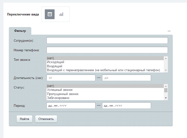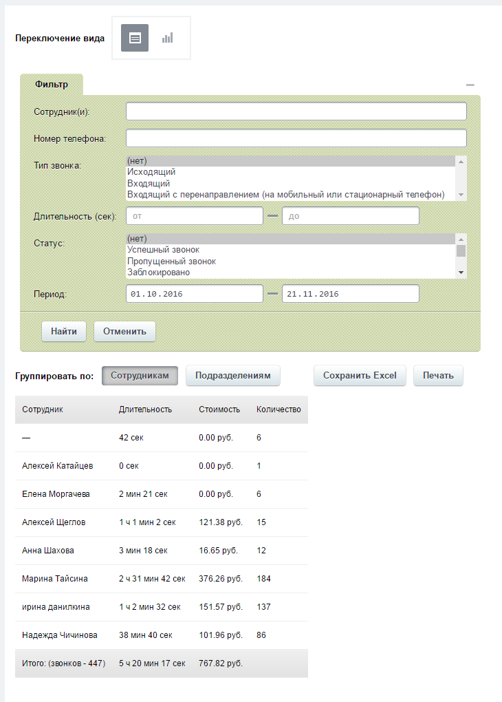 Приложение позволяет сформировать данные по статистике телефонии в двух представлениях: