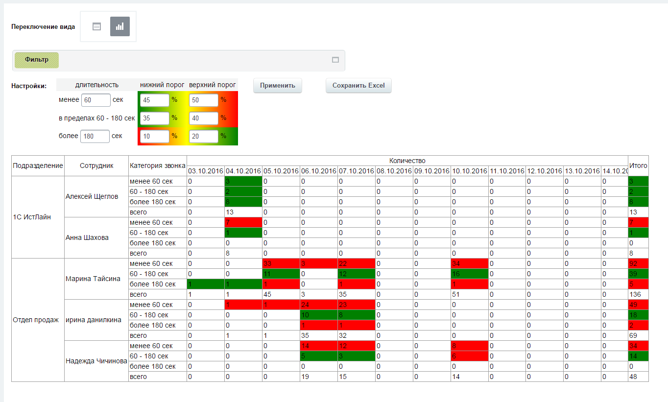 Для получения наглядной картины успешности совершенных звонков представлены настройки - задание пределов длительности звонка для разделения на категории и диапазона удовлетворительных процентов количества звонков из соответствующей категории от общего количества (в таблице: всего за сутки/период в соответствующей графе дата/итого). В результирующей таблице ячейки окрашены соответствующим цветом, звонки сгруппированы по подразделениям и сотрудникам.