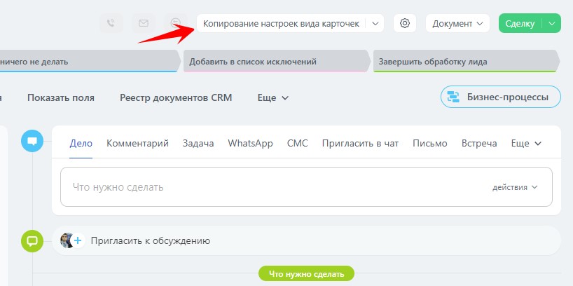 Легко копируйте настройки карточки CRM между воронками, сущностями, пользователями, личными и общими