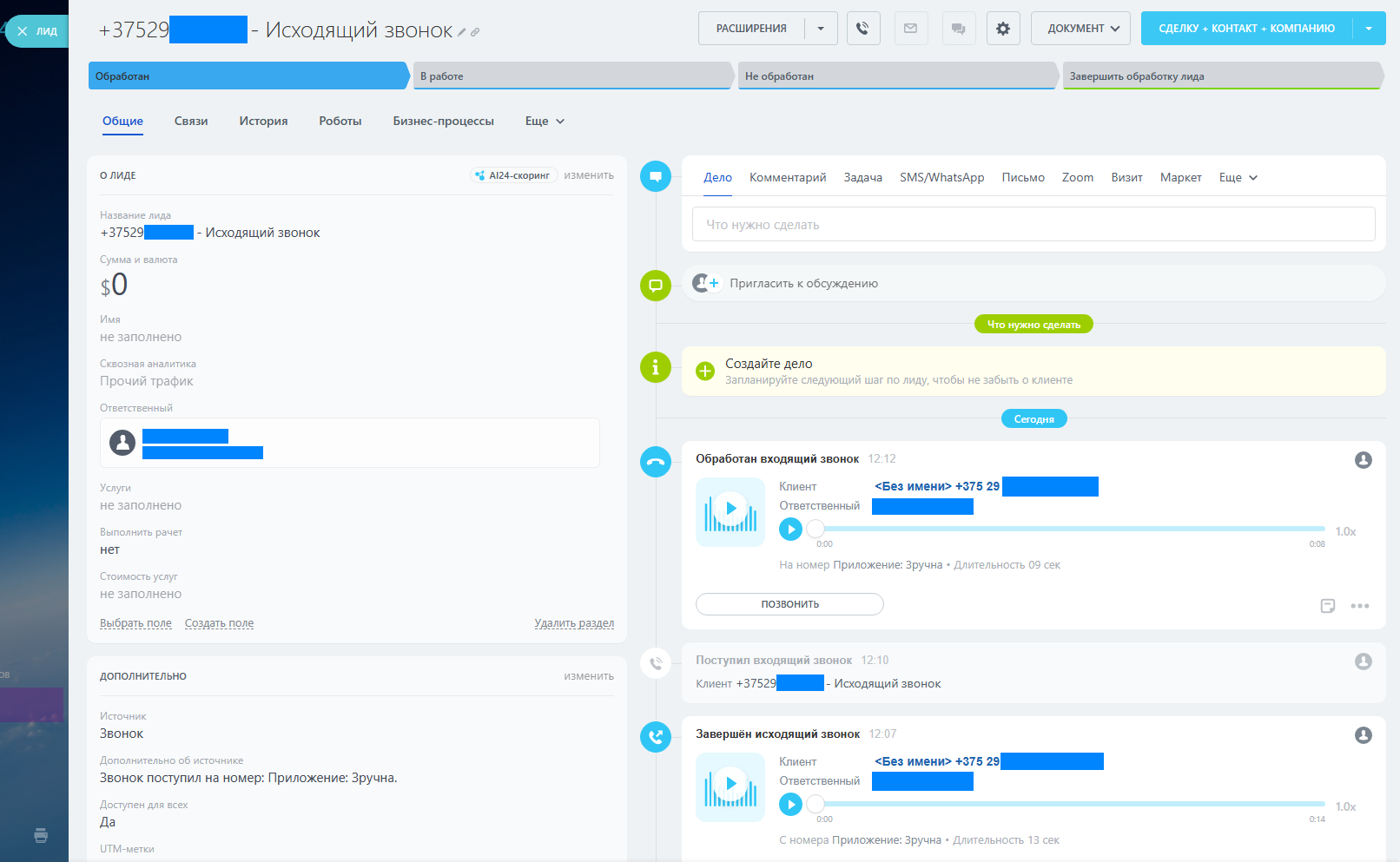 ✓ Для пропущенных звонков к уже имеющимся контактам и лидам создается задача — ни один звонок не потеряется.