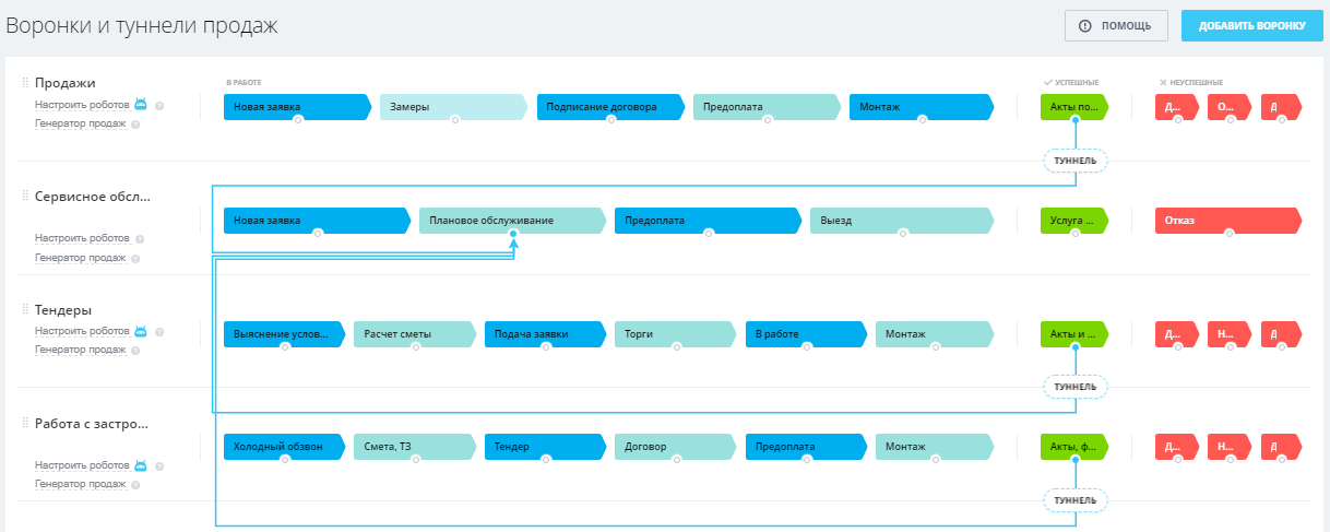 - Туннель продаж предназначен для автоматической связи направлений: «Продажи», «Тендеры», «Работа с застройщиком» с направлением «Сервисное обслуживание». Успешная сделка по каждого из перечисленных направлений автоматически попадает в воронку сервисного обслуживания.