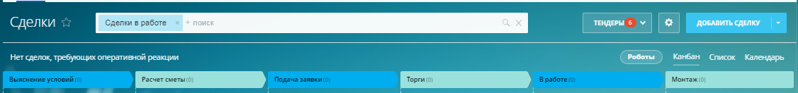 - Воронка для работы с тендерами, включает этапы: Выяснение условий; Расчет сметы; Подача заявки; Торги; В работе; Монтаж; Акты и финальная оплата.