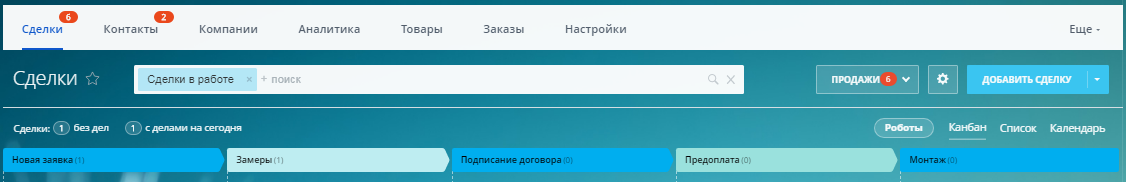 - Готовая воронка продаж со стадиями: Новая заявка; Замеры; Подписание договора; Предоплата; Монтаж; Акты подписаны.