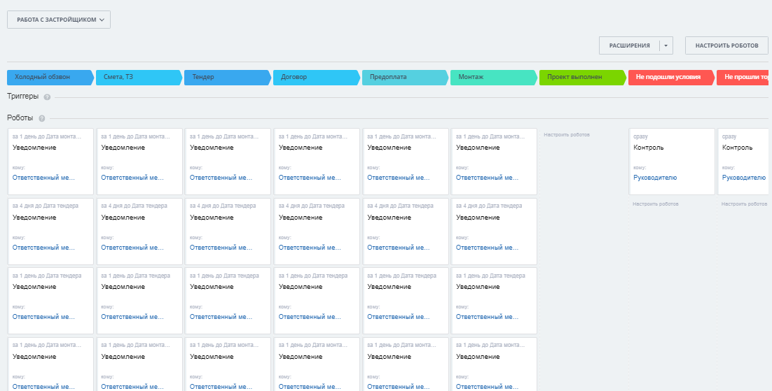 - Работа с застройщиками организованна в отдельном направлении сделок, включающем следующие этапы: Холодный обзвон, Смета, ТЗ, Тендер, Договор, Предоплата, Монтаж, Проект выполнен.