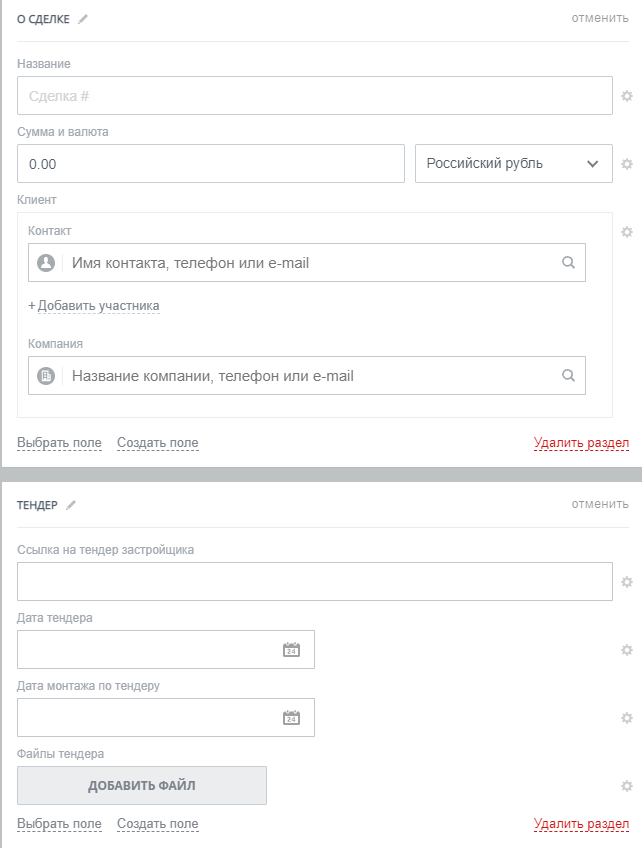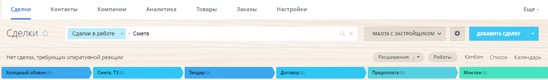 - Направление «Работа с застройщиком» в сделках позволяет организовать работу по тендерам от застройщиков и контролировать этапы работ.