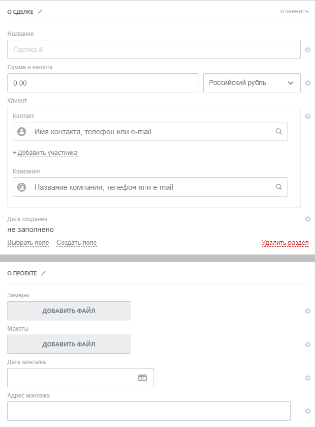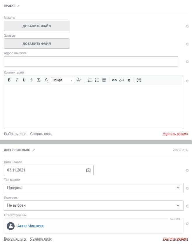 - Настроенные поля в карточке продажи. Поля в сделке: Название, Сумма, Клиент, Дата создания. Поля о проекте: Замеры, Макеты, Дата монтажа, Комментарий. Дополнительные поля: Ответственный, Источник, Тип сделки.
