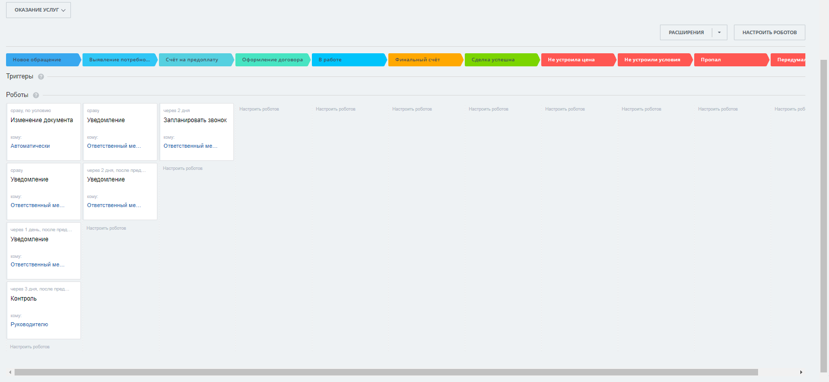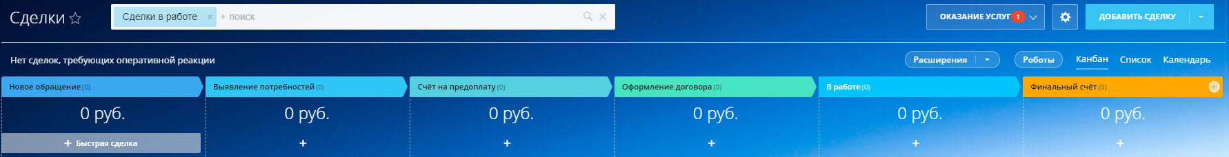 Включает в себя следующие стадии: «Новое обращение», «Выявление потребностей», «Cчёт на предоплату», «Оформление договора», «В работе», «Финальный счёт», «Сделка успешна».