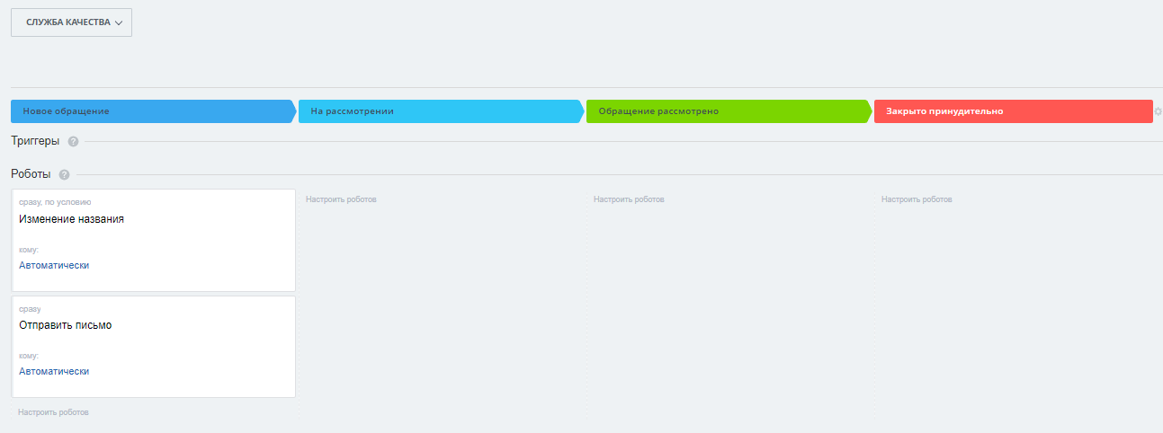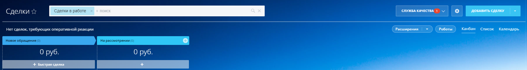 Отдельная воронка для создания внутренней «службы качества» по услугам, оказанным клиентам. Включает в себя следующие этапы: «Новое обращение», «На рассмотрении», «Обращение рассмотрено».