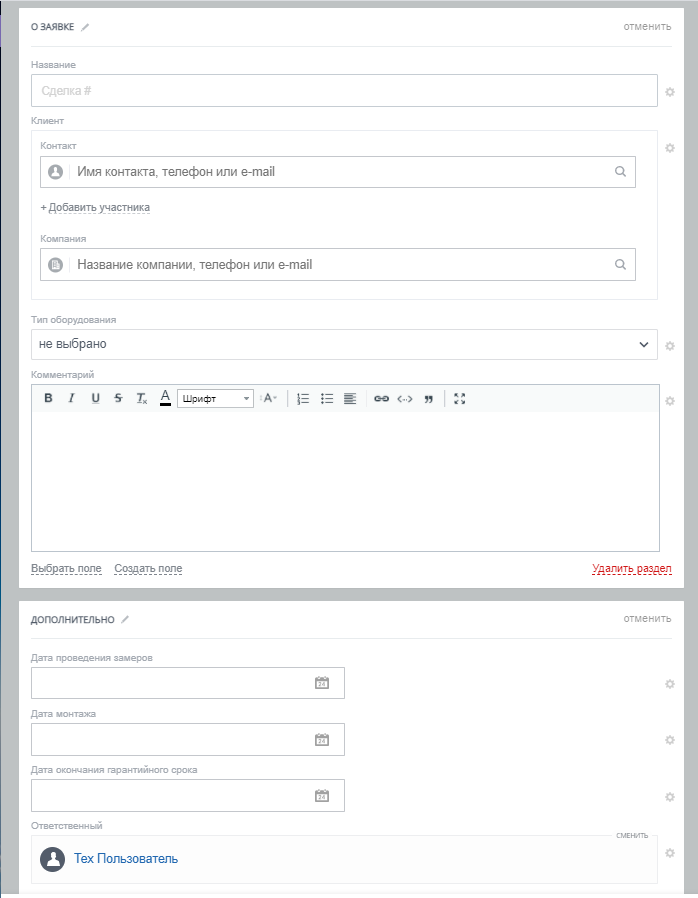 Блок включает в себя готовую воронку со стадиями: «Новая заявка», «Выезд на объект, замеры», «Коммерческое предложение», «Договор», «Предоплата», «Заказ оборудования», «Монтаж и настройка», «Акты подписаны». Подходит как для ведения всех заявок на продажу оборудования, так и для отслеживания работ по его монтажу и настройке (при помощи инструмента «Задачи и проекты»).