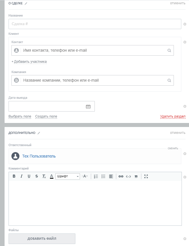 В зависимости от потребностей, форма может быть установлена на сайте или отправляться клиенту по ссылке. При заполнении формы клиент указывает свои контактные данные, тип требуемой услуги, а также может приложить файлы по заявке.