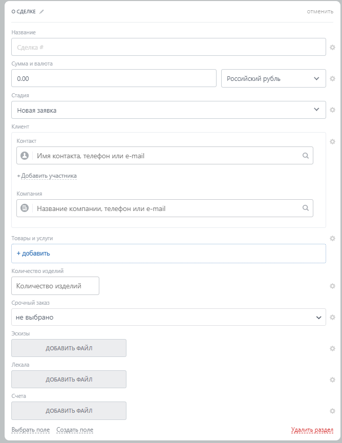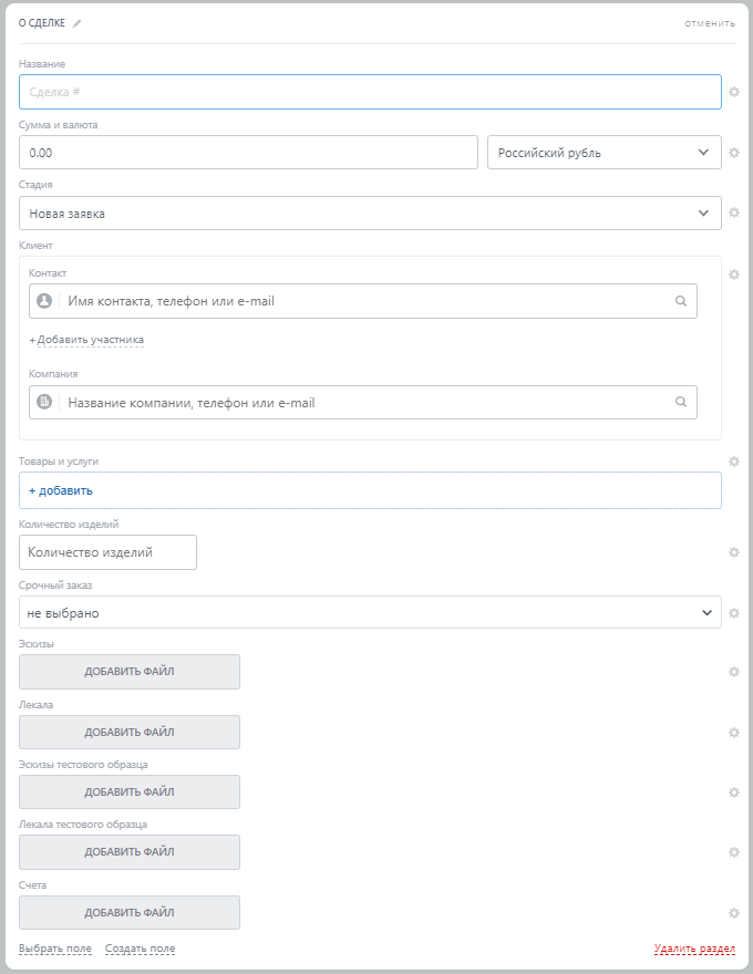 В рамках данного решения были созданы следующие пользовательские поля в Сделках: "Эскизы", "Лекала", "Срочный заказ", "Количество изделий", "Фото", "Обращение", "Требуется тестовый образец", "Эскизы тестового образца", "Лекала тестового образца", "Счета"