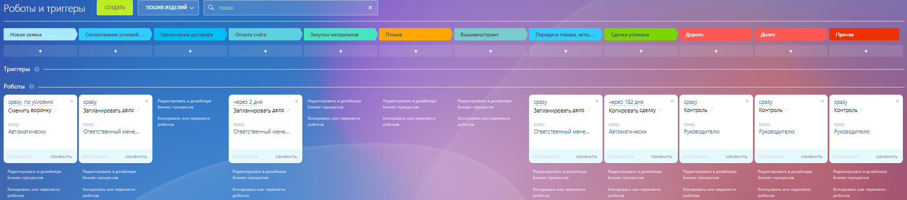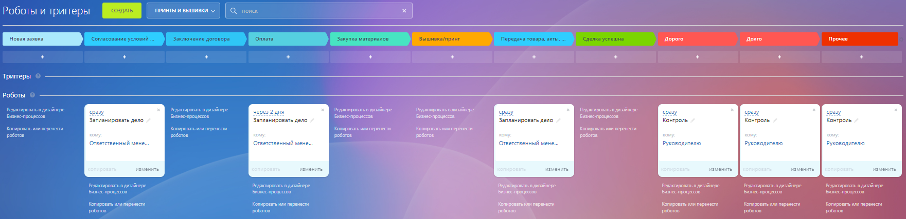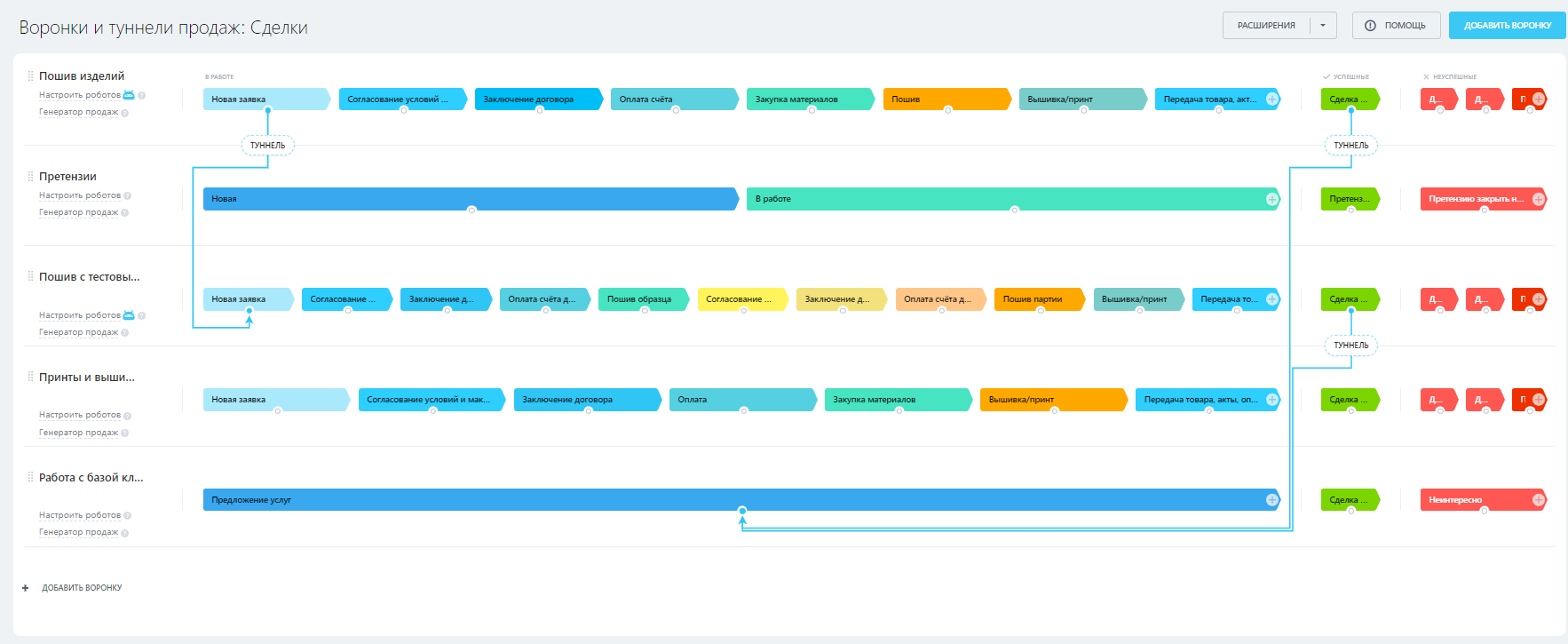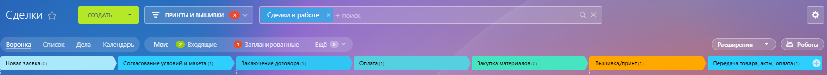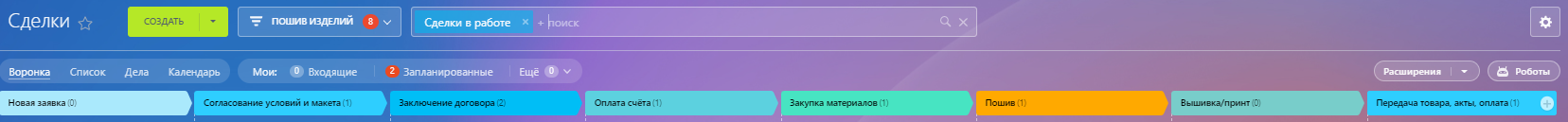 Воронка для предоставления услуг по нанесению принтов и вышивок на изделия, включает в себя этапы: «Новая заявка», «Согласование условий и макета», «Заключение договора», «Оплата», «Закупка материалов», «Вышивка/принт», «Передача товара, акты, оплата», «Работы завершены». Были предусмотрены также варианты неуспешного завершения Сделки в стадии: «Дорого», «Долго», «Прочее».