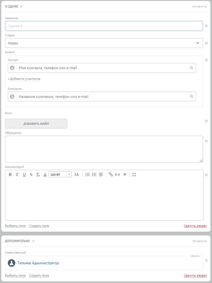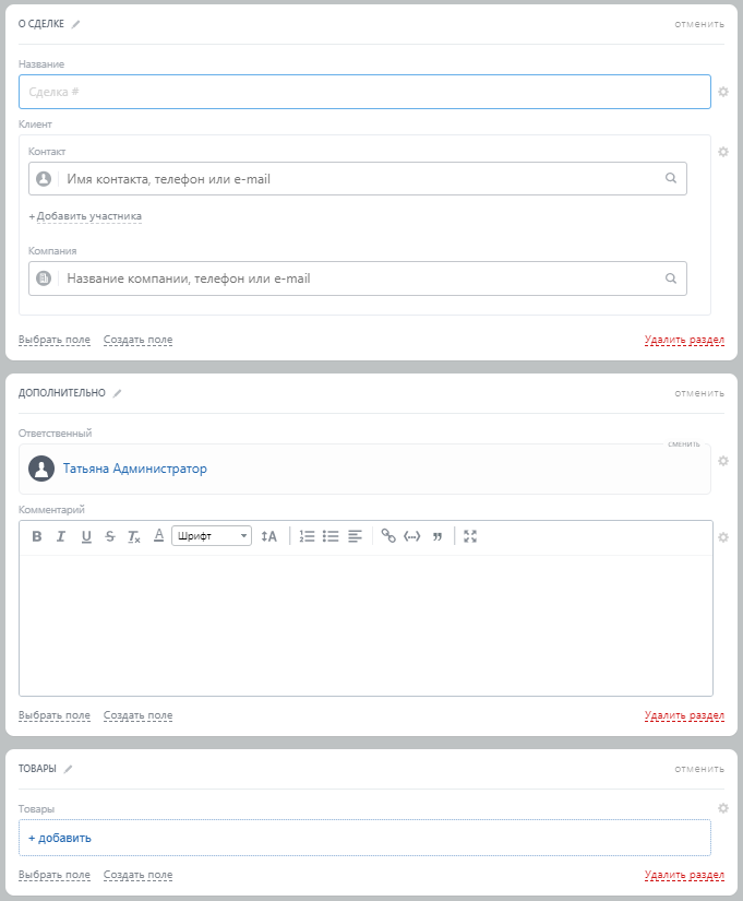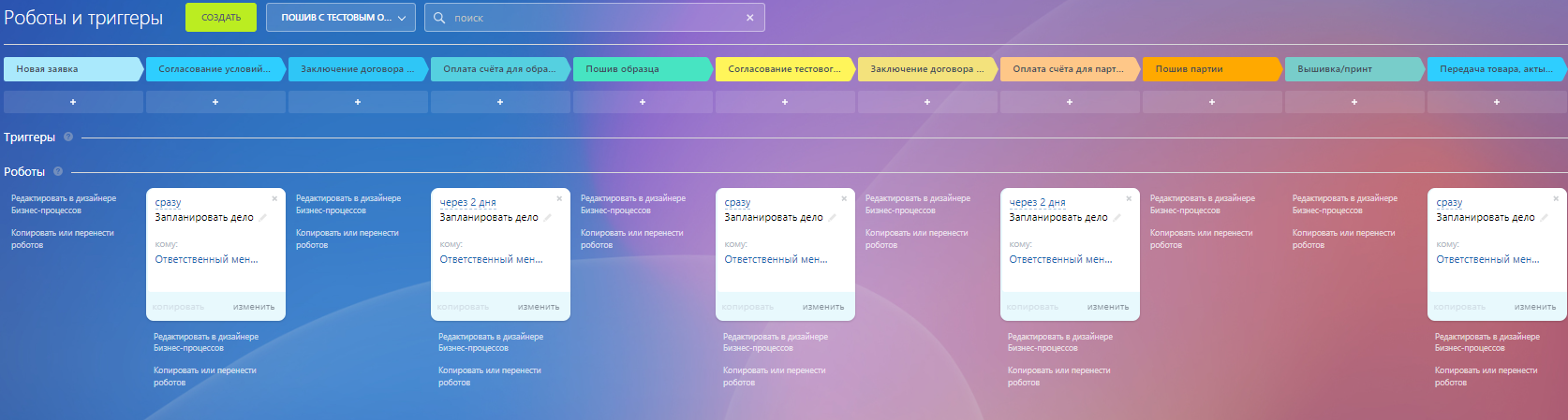 При создании сделки, а также на этапах «Согласование тестового образца» и «Передача товара, акты, оплата» для ответственного будет запланировано дело «Созвониться с клиентом».