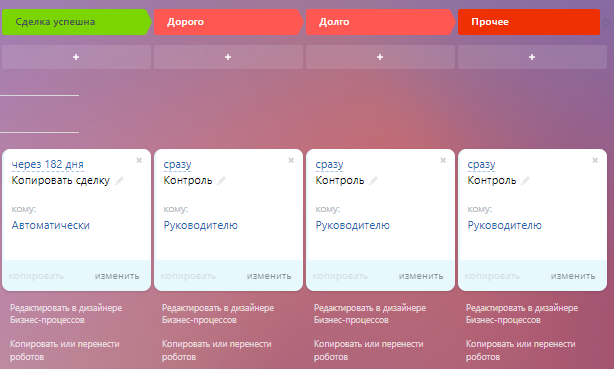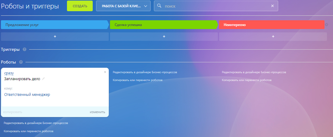 Если сделка была завершена успешно, то через 182 дня система автоматически создаст новую сделку в направлении «Работа с базой клиентов».