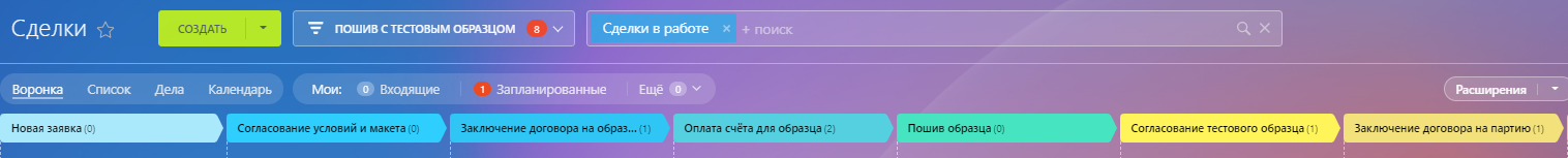 Воронка позволяет производить обработку более сложных обращений от клиентов, требующих предварительного изготовления тестового образца, и собирать по ним отдельную статистику.