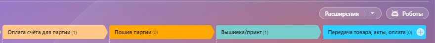 Включает в себя следующие стадии: «Новая заявка», «Согласование условий и макета», «Заключение договора на образец», «Оплата счета для образца», «Пошив образца», «Согласование тестового образца», «Заключение договора на партию», «Оплата счета для партии», «Пошив партии», «Вышивка/принт», «Передача товара, акты, оплата», «Сделка успешна».