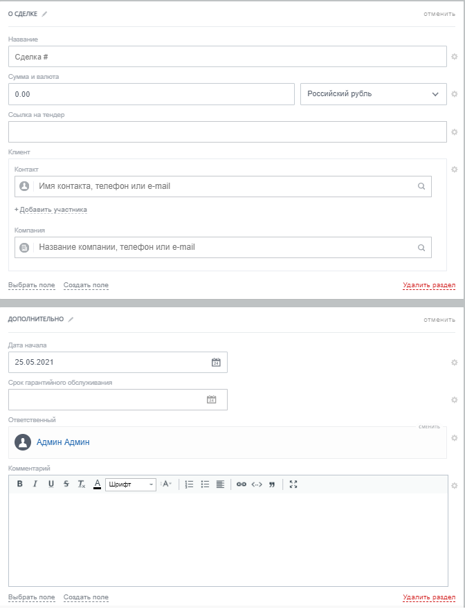 Карточка сделки для работы с тендером состоит из полей: Название, Сумма, Ссылка на тендер, Клиент, Дата начала, Срок гарантийного обслуживания, Ответственный, Комментарий.