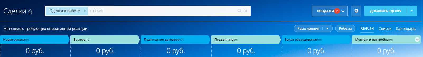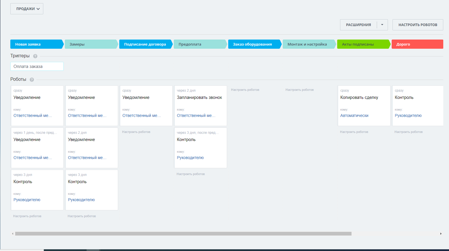 Готовая воронка продаж со стадиями: Новая заявка; Замеры; Подписание договора; Предоплата; Заказ оборудования; Монтаж и настройка; Акты подписаны.