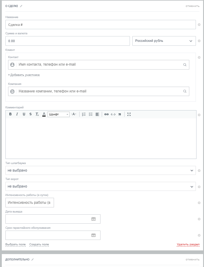 Карточка сделки для сервисного обслуживания состоит из полей: Название, Сумма, Клиент, Комментарий, Тип шлагбаума, Тип ворот, Интенсивность работы (в сутки), Дата выезда, Срок гарантийного обслуживания, Ответственный.
