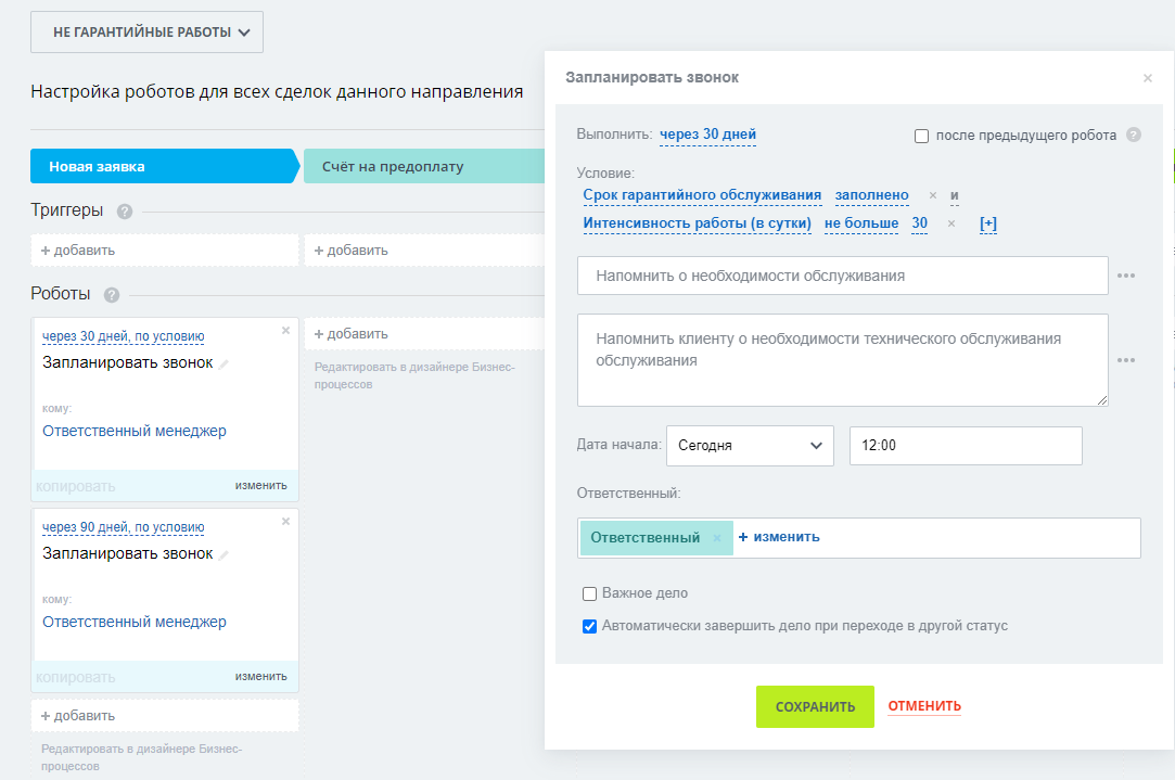 Автоматическое планирование звонка через 2 дня после перевода сделки в стадию «Предоплата» в воронке Продажи. Если через 3 дня после этого сделка осталась на этой стадии, то руководителю ответственного менеджера придет уведомление о необходимости контроля ситуации.